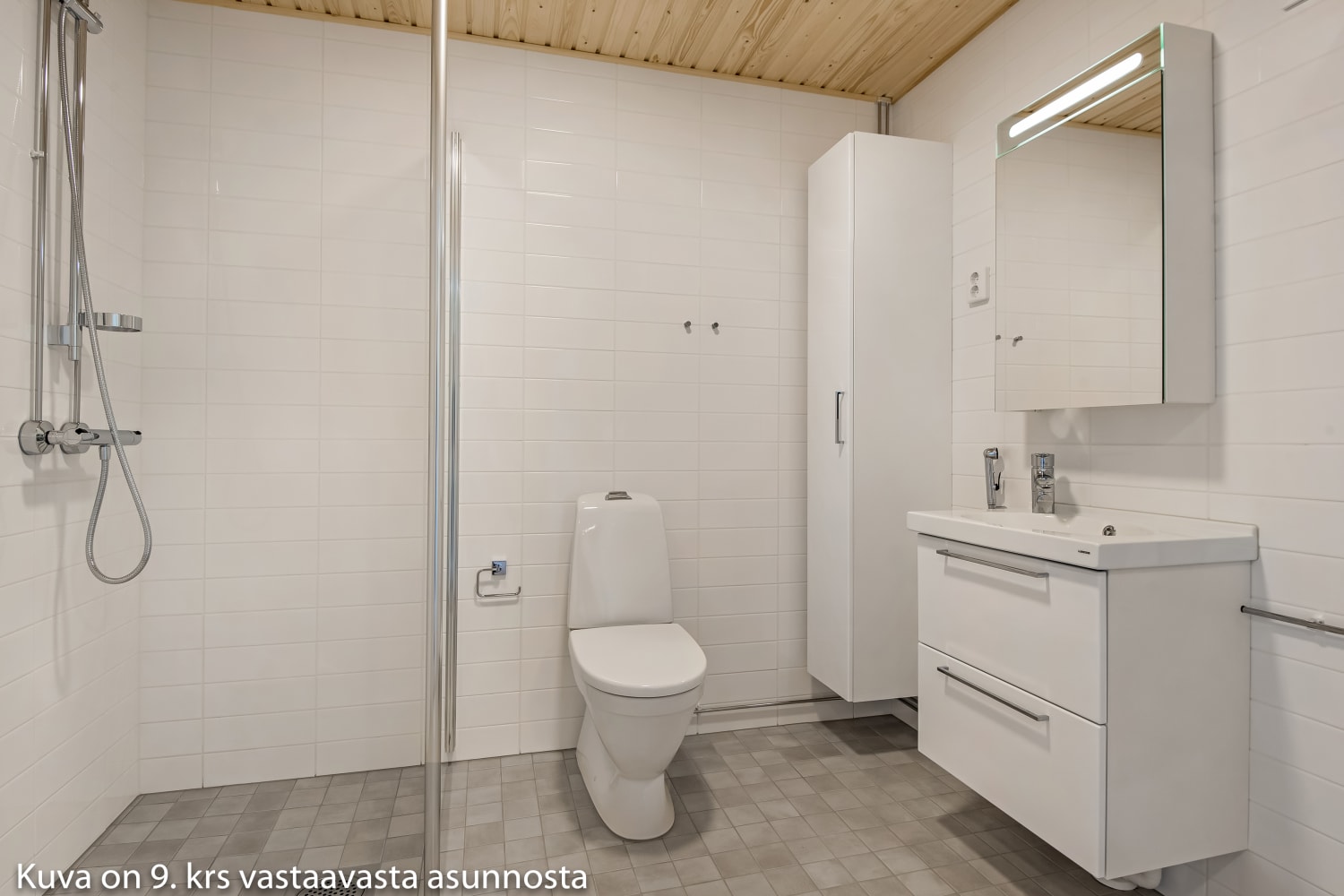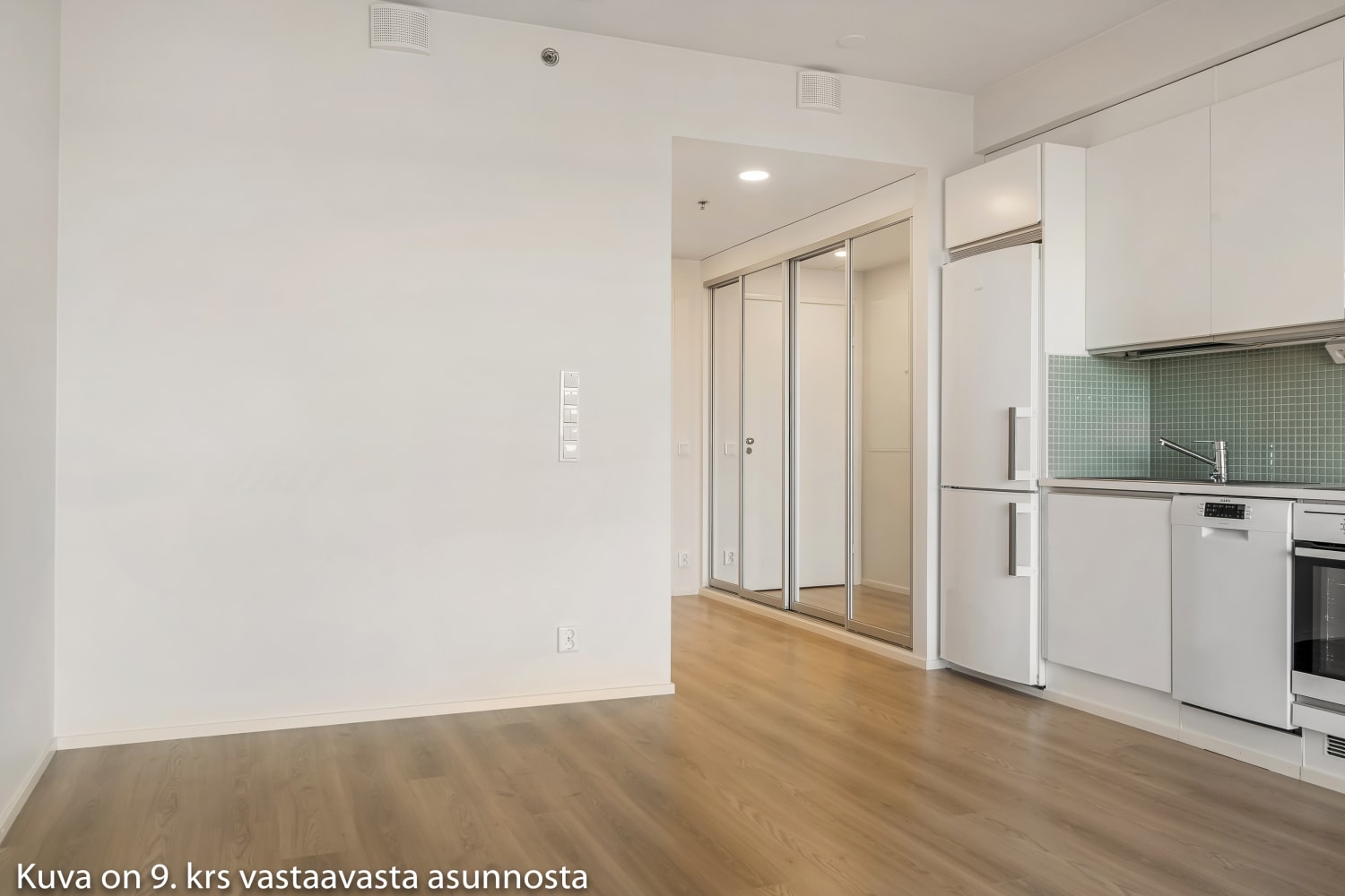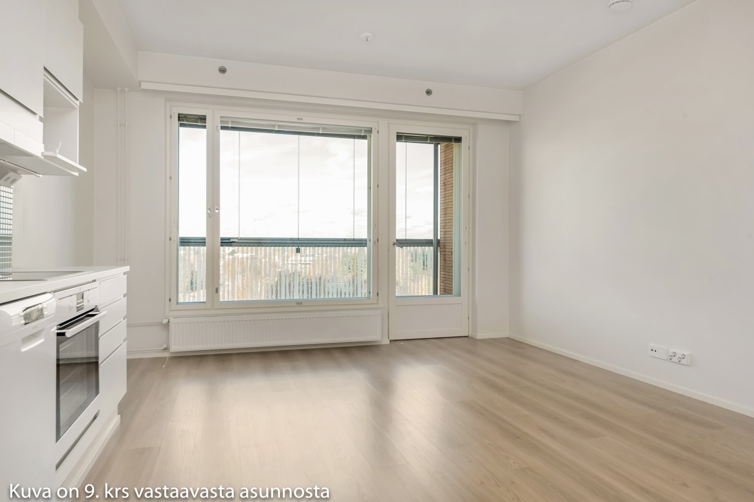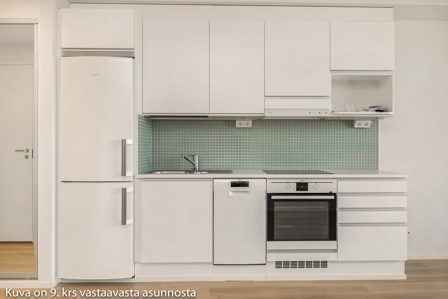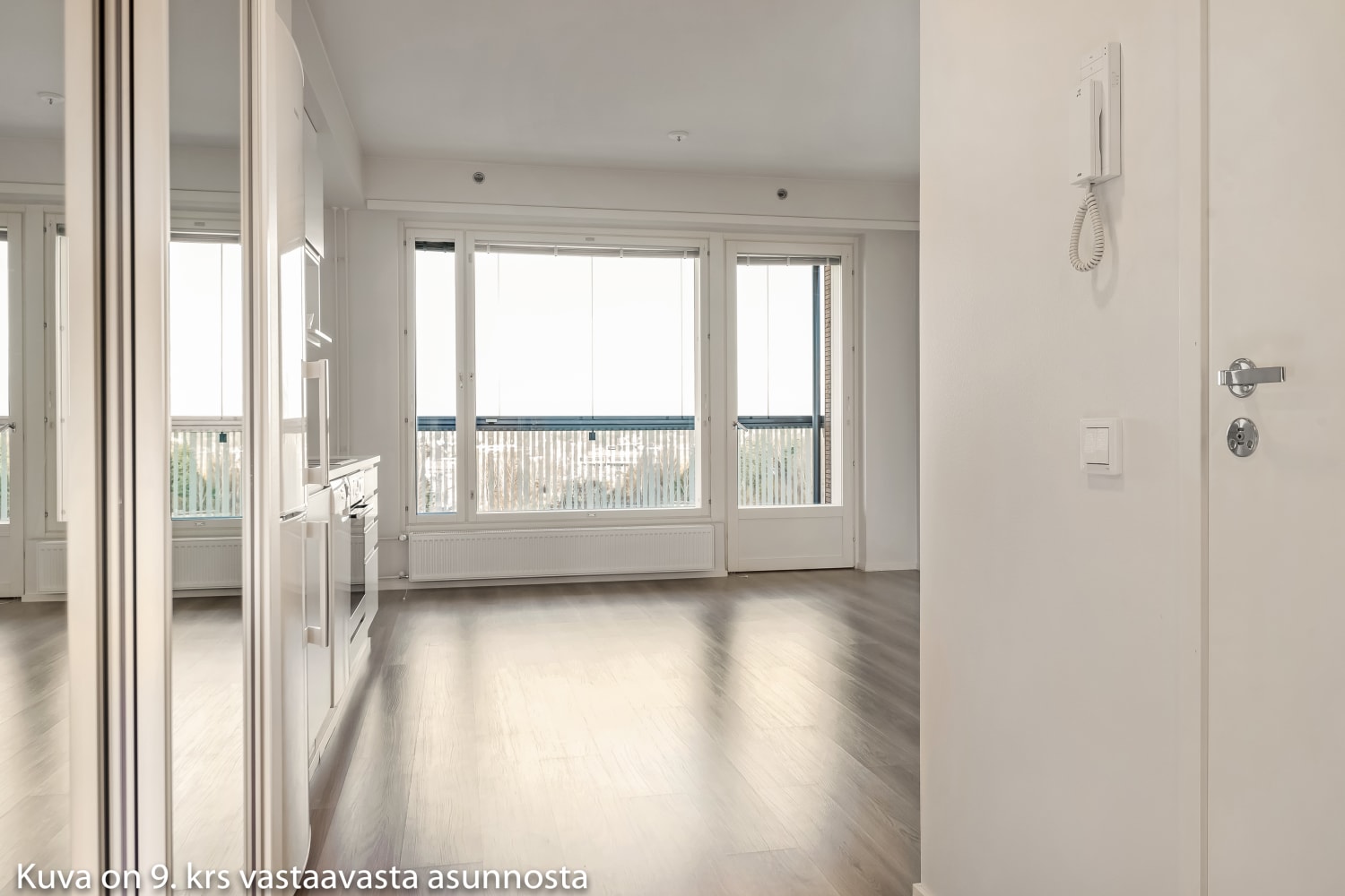The layout of this elevated cosy home is open and practical. Cabinets are neatly grouped along one wall, leaving the other side of the apartment as open space that can be easily furnished to your taste. The glazed balcony facing Merituulentie is perfect as a haven for a potted gardener or a relaxed spot for coffee.