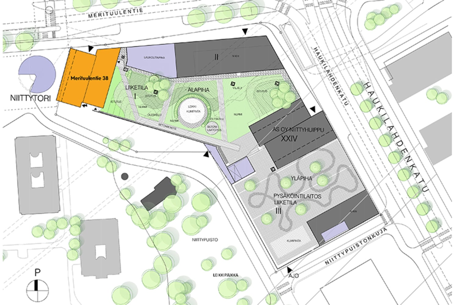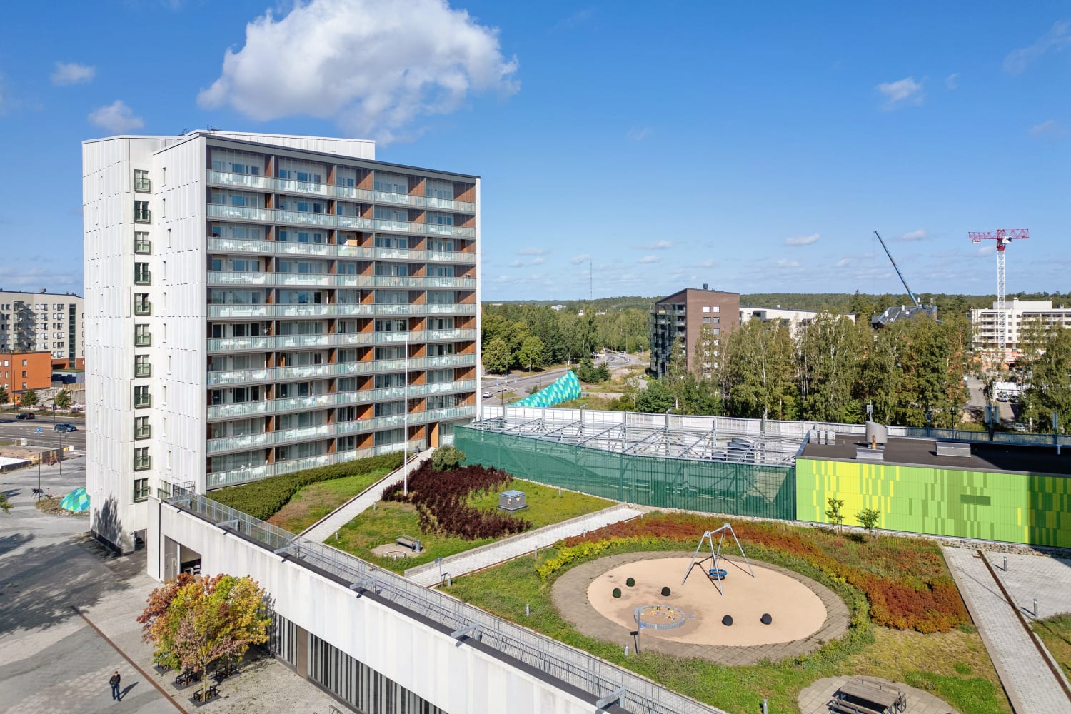 Merituulentie 38 is located in conjunction with the Niittykumpu Metro Centre in the eastern part of the block. The 12-storey building has 94 apartments from studios to one-bedrooms and efficient two-bedrooms suitable for small families. These homes have smart layouts and kitchen areas opening to the living room and therefore creating a living area with a spacious feel. All excluding one apartment have a glassed-in balcony with a practical storage area. Residential comfort in this building is further increased by highly functional communal areas: a sauna section, a laundry and drying room and storage rooms for outdoor equipment, baby transport and other items. The grounds shared by As. Oy Niittyhuipun for relaxation and play can be found in the courtyard on two different levels. The car parking spaces are located in a parking facility underneath the block.