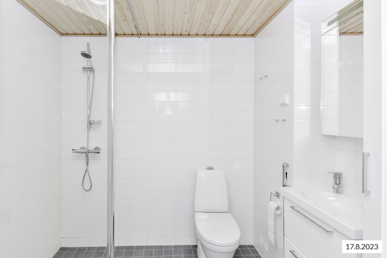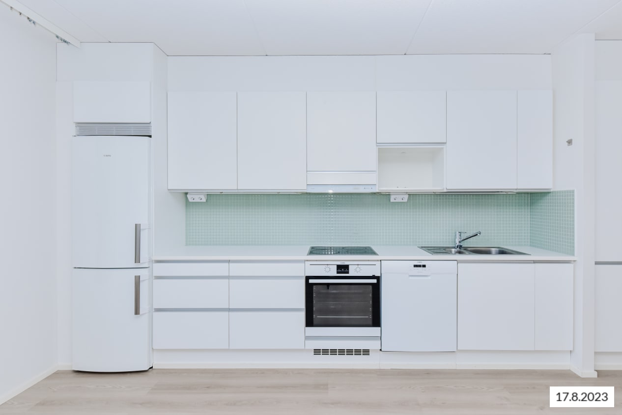 This light-toned small home rises high with an open and practical layout. All cabinets are clearly arranged along one wall, making it easy to furnish the other side to your liking. The glazed balcony facing west offers views towards Merituulentie. There is storage space suitable for hobbies in the corner of the balcony.