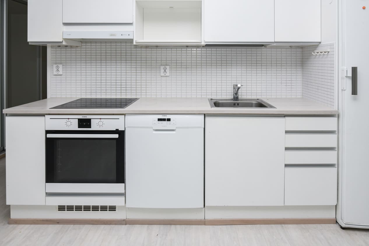 The floors of the living areas are laminated in a bleached oak shade. The hallway's sliding wardrobe doors are mirrored, and other storage units are white. The kitchen cabinets are white, with the space between the upper and lower cabinets tiled with shiny white tiles. The worktop is laminate resembling white wood surface. The kitchen is equipped with a ceramic hob and separate oven, dishwasher, and freezer-refrigerator.