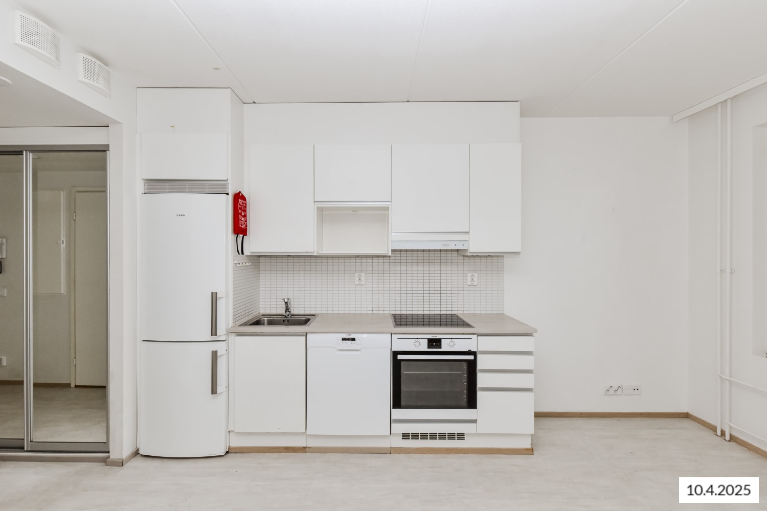 The floors in the living areas are beautiful laminate in bleached oak tones. The hallway sliding door wardrobe has mirror doors, and other cupboard fixtures are white. The kitchen cabinet doors are white, and the space between the upper and lower cabinets is tiled with shiny white tiles. The worktop is laminate resembling white wood surface. The equipment includes a ceramic hob and separate oven, dishwasher, and freezer-refrigerator.