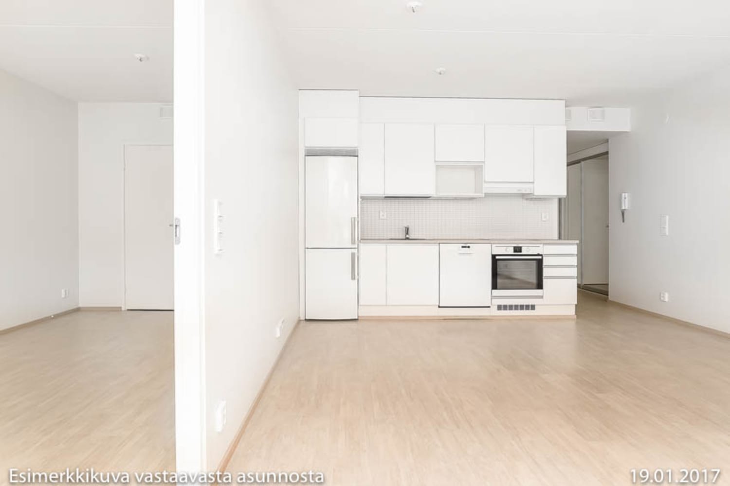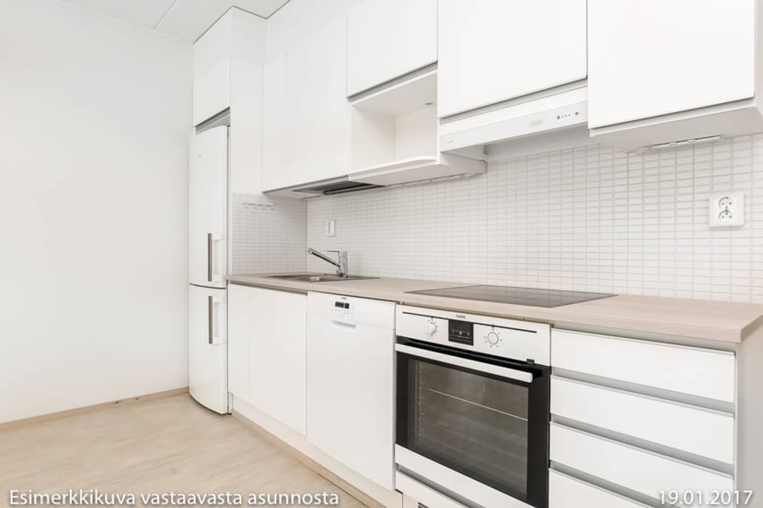 The floors in the living areas are laminated in a bleached oak shade. The hallway features sliding wardrobe doors with mirrors, while other storage units are white. The kitchen cabinet doors are white, with the space between the upper and lower cabinets tiled with glossy white tiles. The worktop is laminate mimicking a white wood surface. The kitchen is equipped with a ceramic hob, separate oven, dishwasher, and freezer-refrigerator.