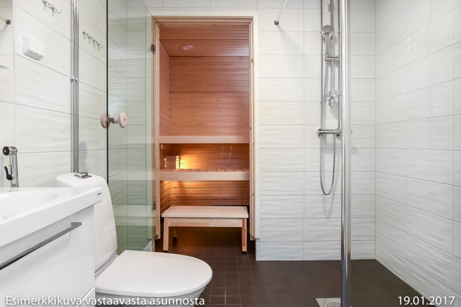 The beautifully light-toned one-bedroom home features a spacious open-plan living area and kitchen, easily furnished to reflect the resident's style. The bedroom boasts a luxuriously spacious walk-in wardrobe for clothes storage. The living room opens onto a glazed balcony spanning the width of the home, and a private sauna offers a relaxing retreat at the end of the day.