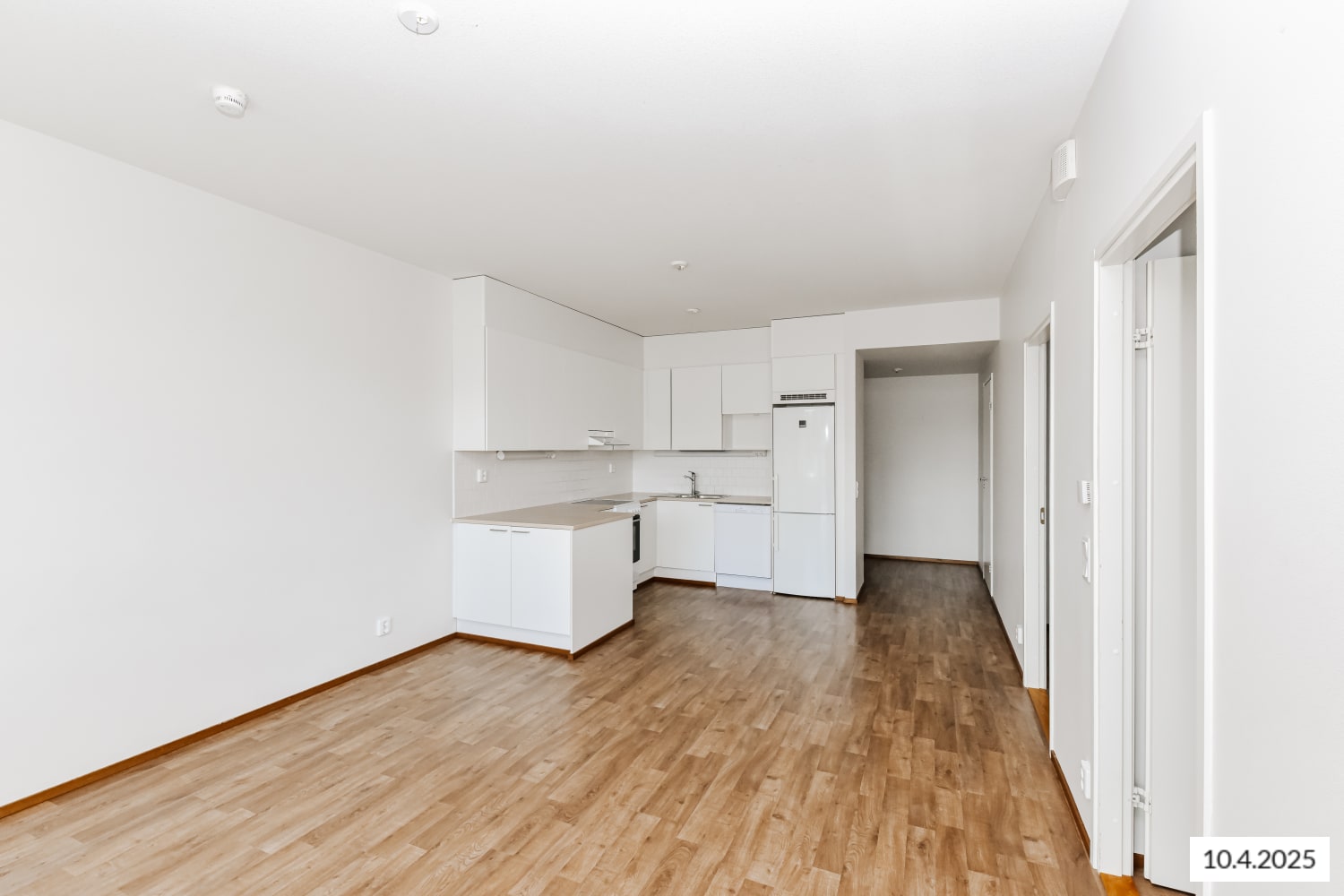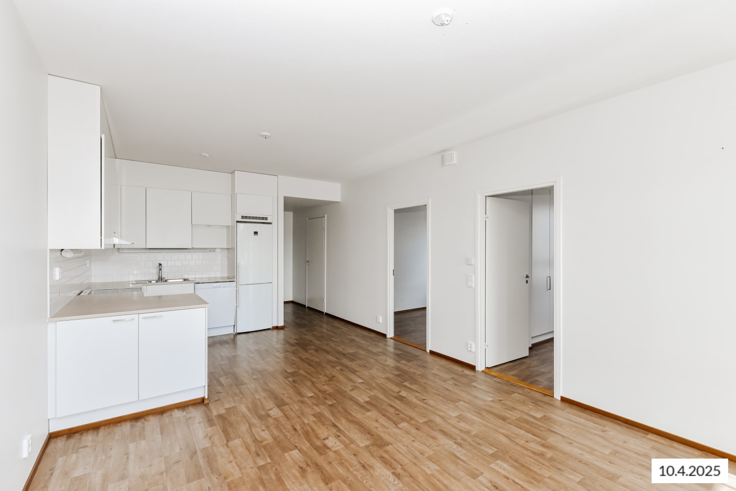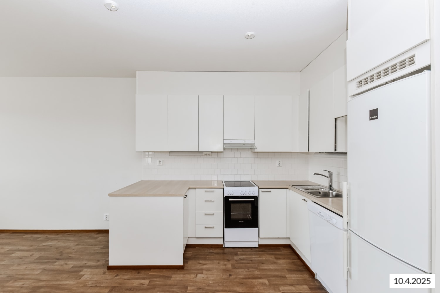 The apartment features stylish laminate flooring. The kitchen has white cabinets, a glossy white tiled backsplash in a brick pattern, and a whitewashed oak-effect laminate worktop. Appliances include a white cooker, dishwasher, fridge-freezer, and a reserved space for a microwave.