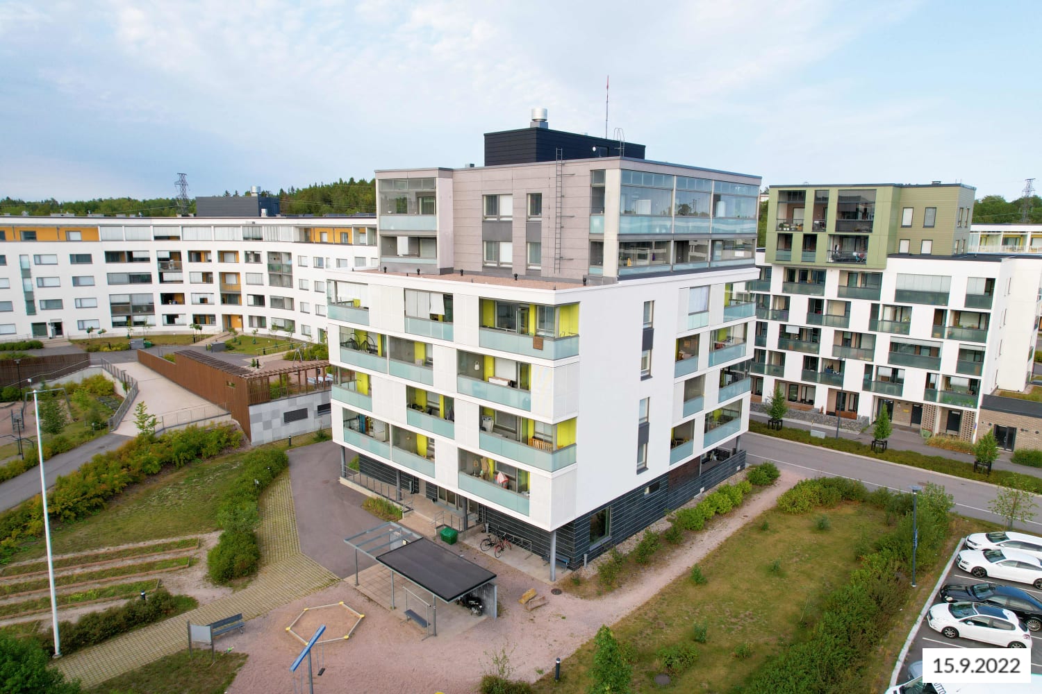 The building’s outdoor equipment, baby carriage and apartment-specific storage units as well as laundry drying room and clubroom are easily accessible on floor 1. There is also a sauna section with a covered cooling-off area on the ground floor. The grounds feature a children’s play area, covered sitting area, apple trees and space for vegetable gardening.