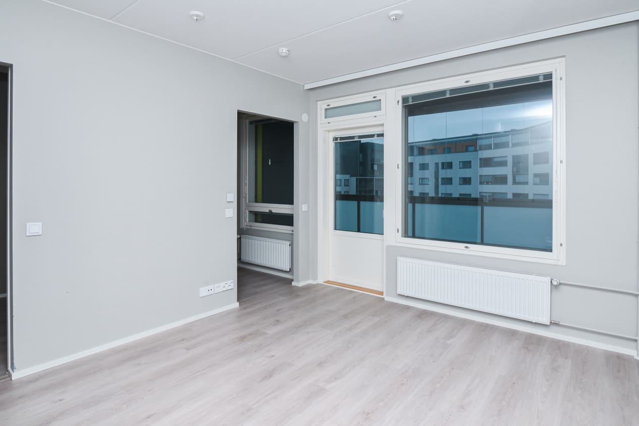This practical one-bedroom home has a cosy atmosphere. The compact kitchen is conveniently connected to the dining area in the living room through a wall opening. The bedroom is separated from the living room by two sliding doors, allowing easy access from both sides of the bed. The balcony, which spans the entire width of the apartment, is glazed.