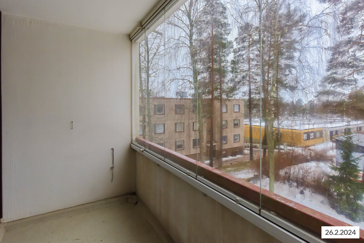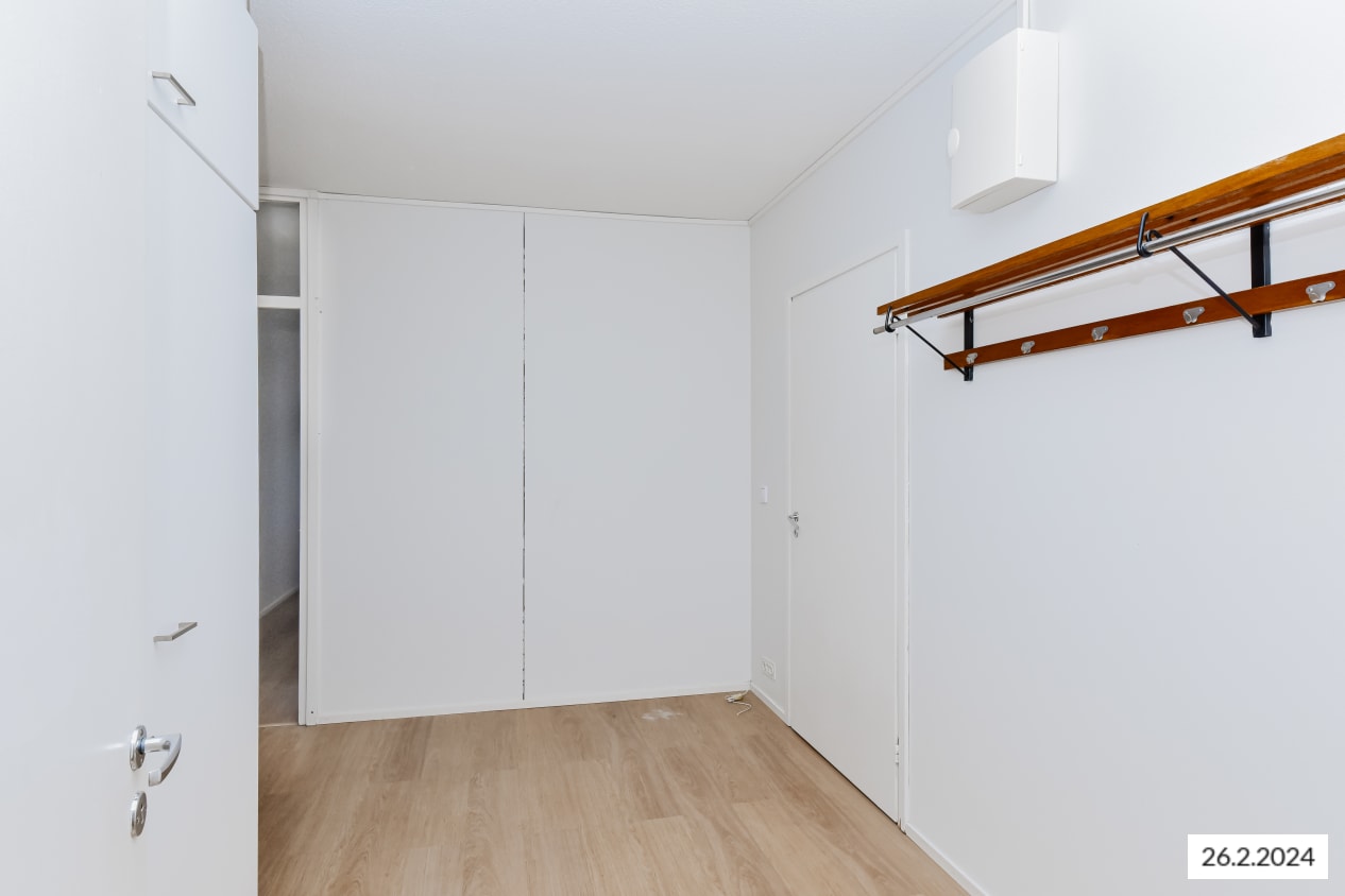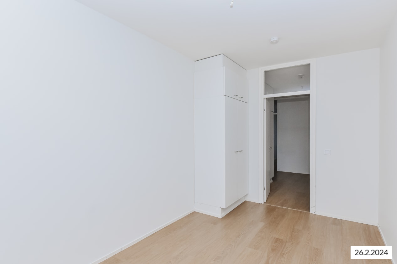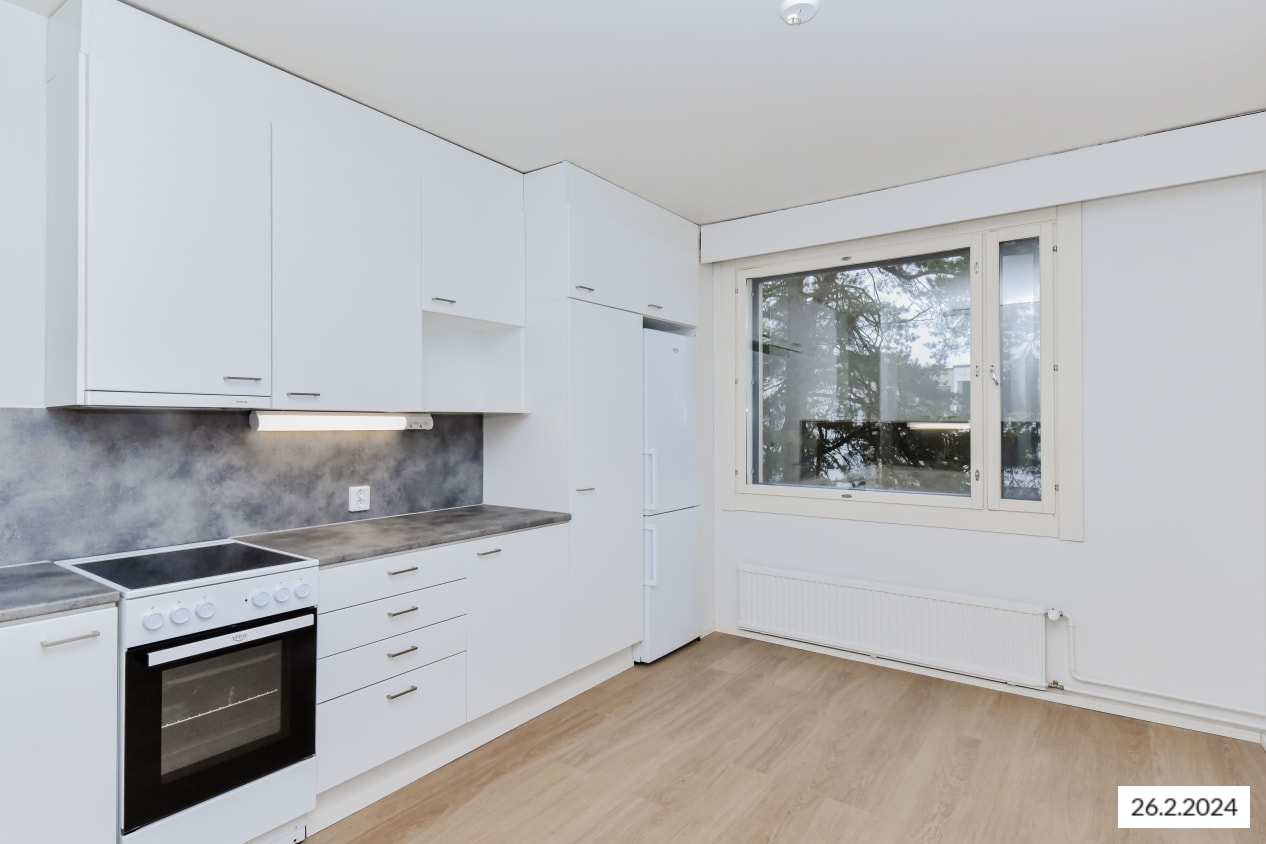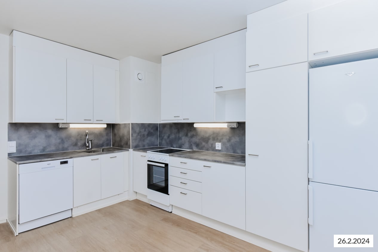 At this building standing on a sloping site next to Soukka library, the units with full kitchens feature balconies and clean layouts. The smaller units with kitchenette are also designed for light and functionality.