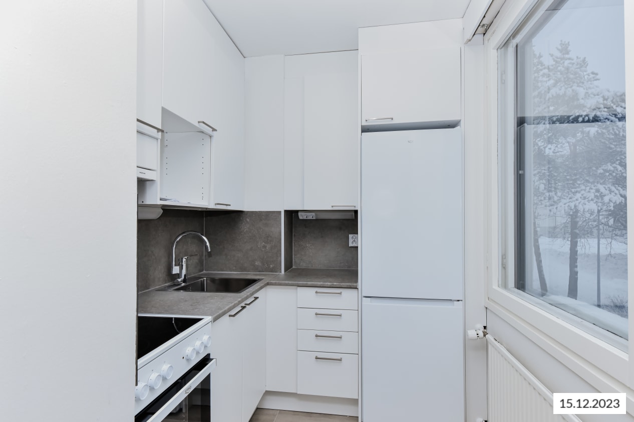 All units at Kaskivuorenkuja 3 have balconies facing either south-southeast or west-southwest and most offer spectacular views over the forests of Espoo all the way to the sea. The units with kitchens at Soukankaari 11-13 have balconies opening from the living rooms and facing south-southeast, while the kitchenettes in the smaller units have windows. All units are bright and spacious.