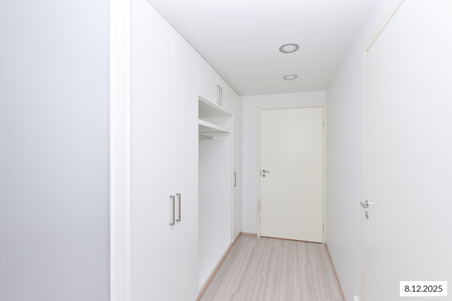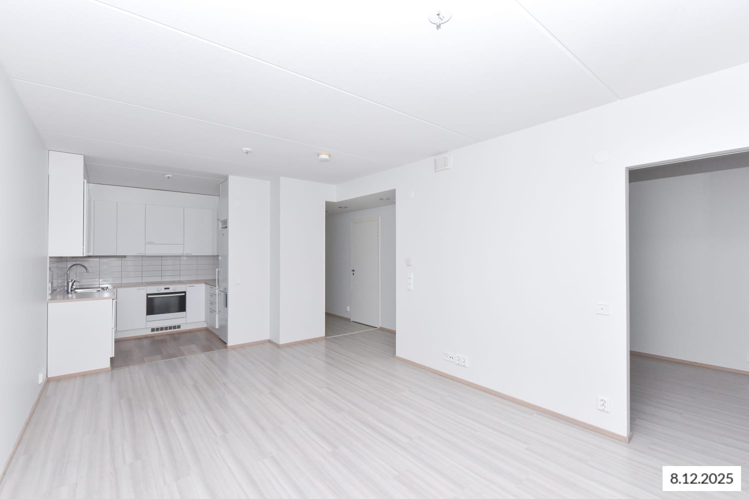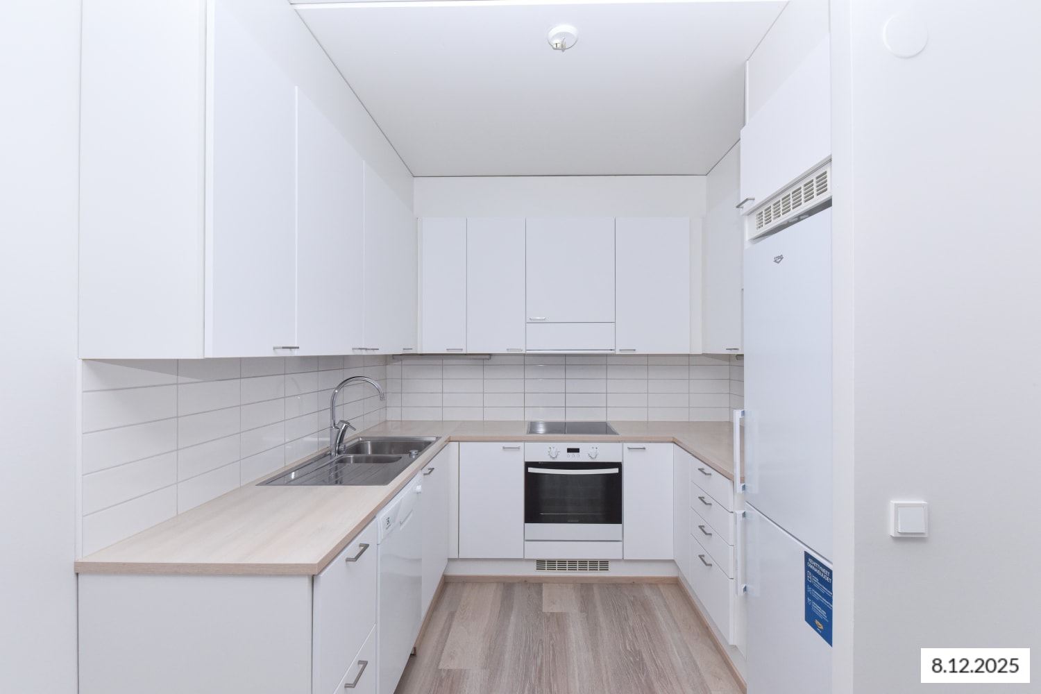 The floors in the living areas are light oak laminate. The kitchen features white cabinets and light oak laminate countertops with integrated stainless steel sinks. The space between the cabinets and countertop is tiled with white tiles. Kitchen amenities include a ceramic hob embedded in the countertop, a separate oven, a dishwasher, a freezer-refrigerator, and a provision for a microwave.