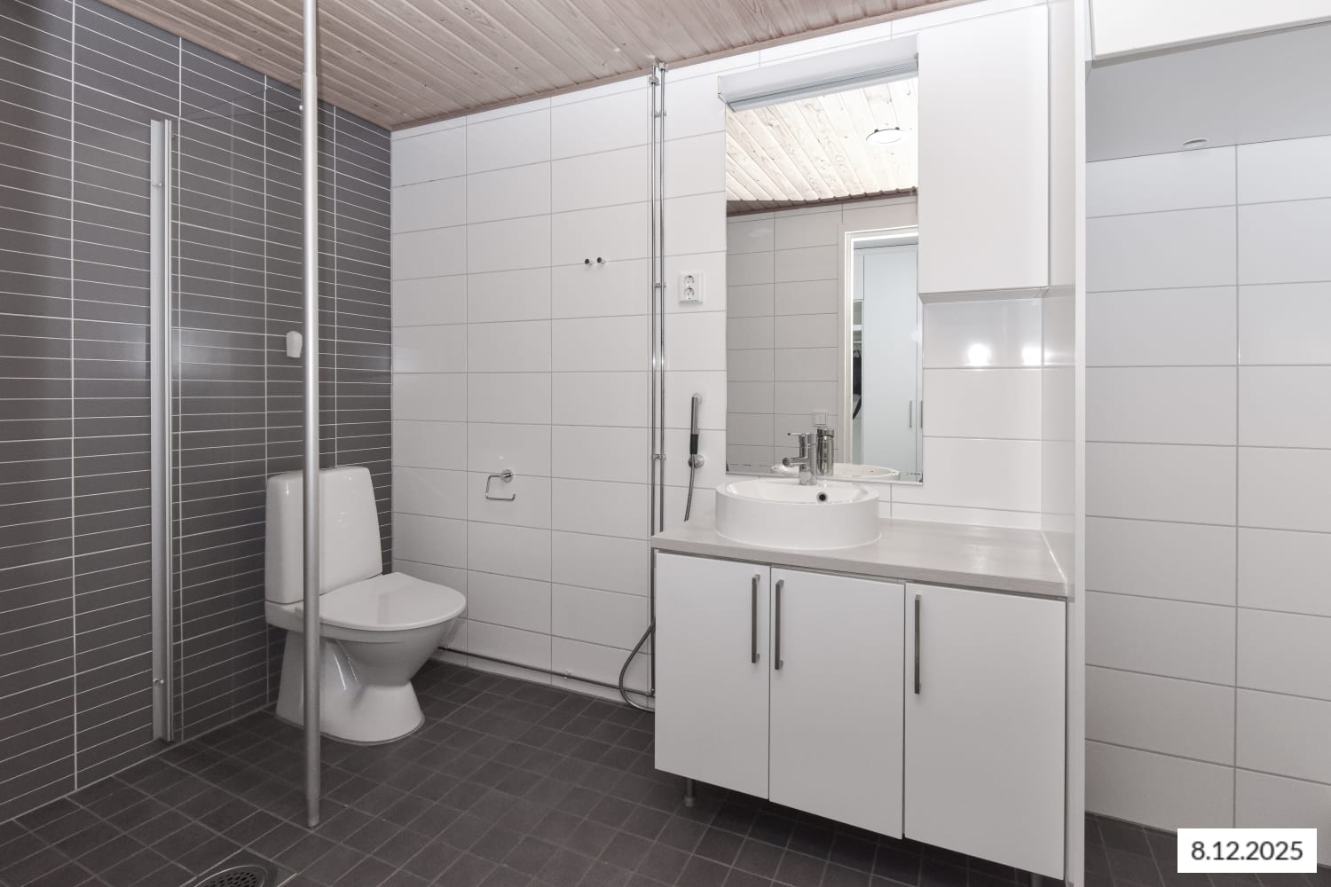 The generously sized bathroom has predominantly fresh white wall tiles. Accent walls and floors are grey tiles. Bathroom fixtures are white, and the washbasin is a cast marble basin installed on a wood-toned surface. Provision for a washing machine and dryer.