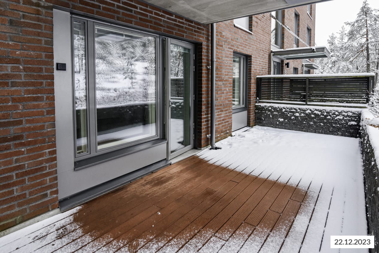The ground floor spacious one-bedroom home's understated materials and stylish kitchen provide a framework for a variety of interior designs. The heart of the home is the bright living room, which is connected to the kitchen with space for a dining table. The living room has access to its own garden terrace. The floors in the living areas are light oak laminate.