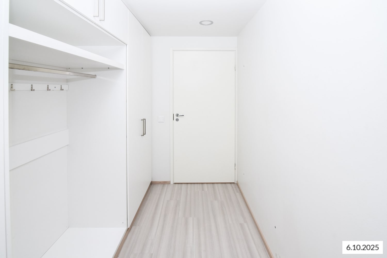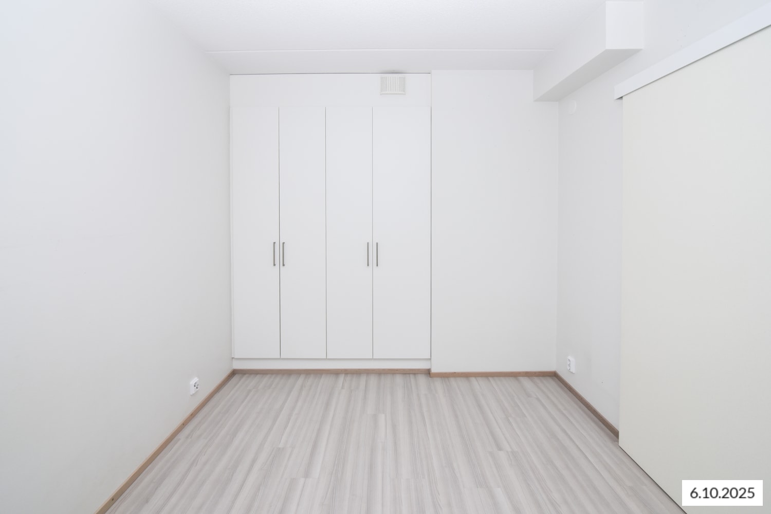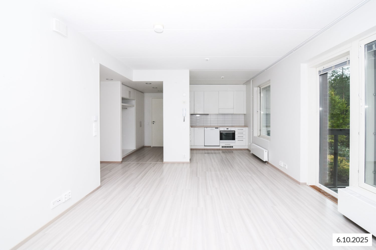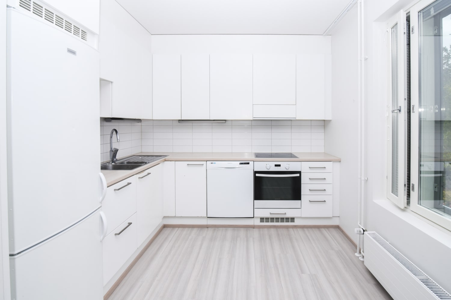 The floors of the living areas are light oak laminate. The kitchens feature white cabinets and light oak-toned laminate worktops with integrated stainless steel sinks. The space between the cabinets and worktop is tiled with white tiles. The kitchen is equipped with a ceramic hob integrated into the worktop, separate oven, dishwasher, freezer-refrigerator, and provision for a microwave.