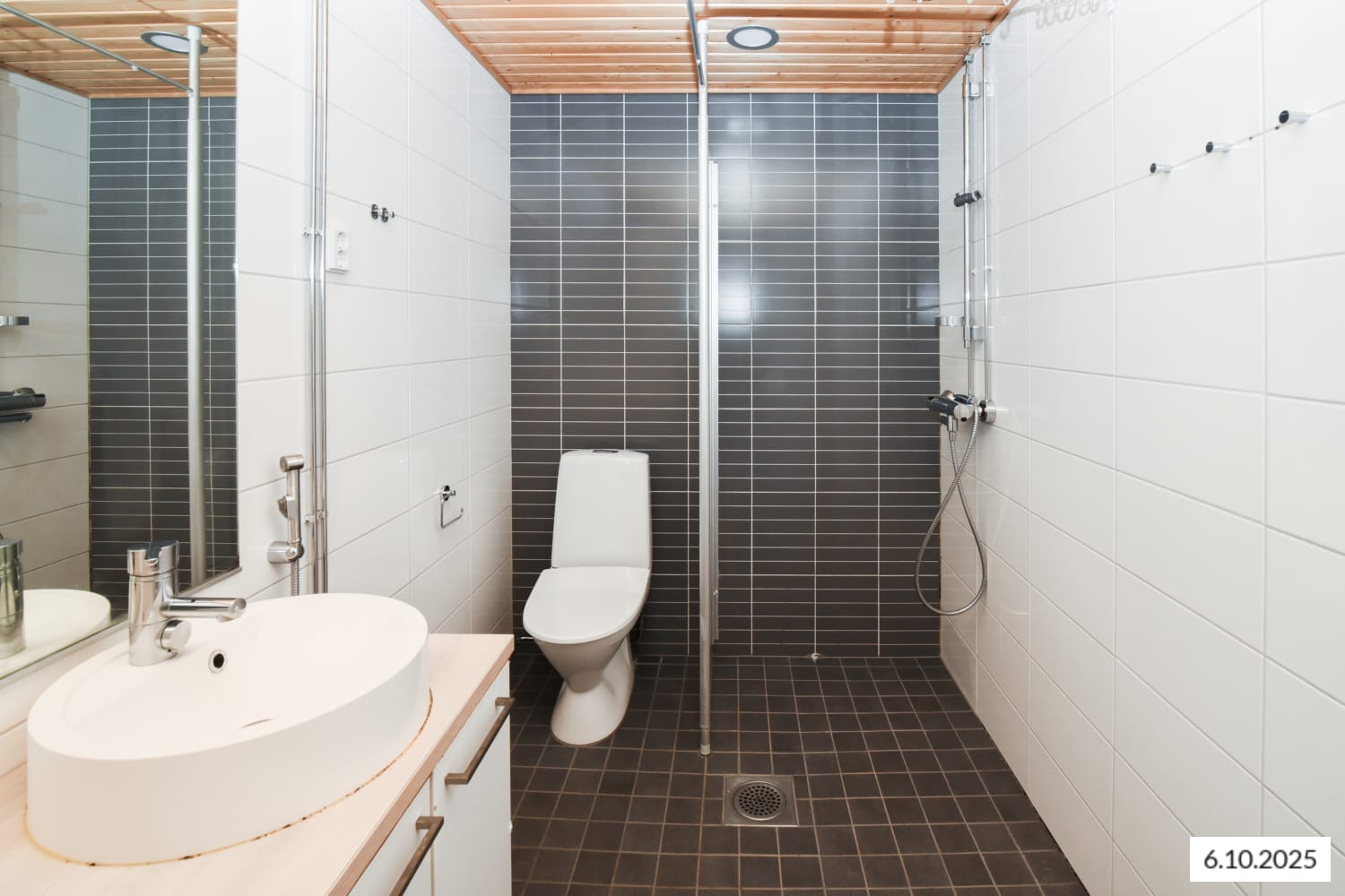 The generously sized bathroom predominantly features fresh white wall tiles. Accent walls and floors are grey tiles. Bathroom furniture is white, and the sink is a cast marble basin installed on a wood-toned surface. There is provision for a washing machine and tumble dryer.