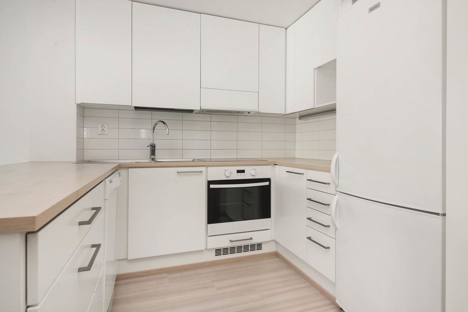 The floors in the living areas are light oak laminate. The kitchens feature white cabinets and light oak-coloured laminate worktops with built-in stainless steel sinks. The space between the cabinets and the worktop is tiled with white tiles. Kitchen equipment includes a ceramic hob integrated into the worktop, a separate oven, a dishwasher, a freezer-refrigerator, and a provision for a microwave.