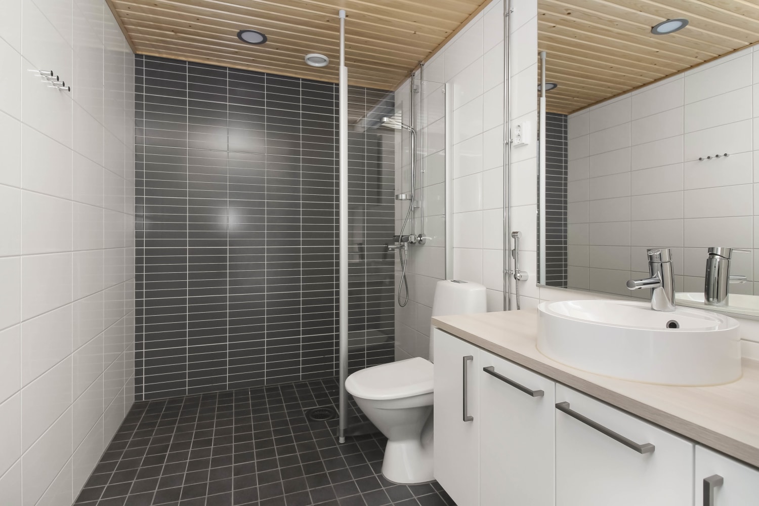 The generously sized bathroom mainly features fresh white wall tiles. Accent walls and floors are tiled in grey. The bathroom fixtures are white, and the washbasin is a cast marble basin installed on a wood-toned countertop. There is provision for a washing machine and a tumble dryer.