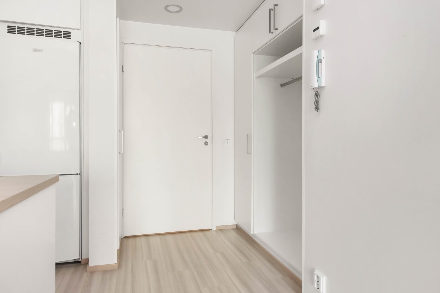 The understated materials and stylish kitchen of this well-designed one-bedroom home provide a framework for a variety of interior styles. The focal point of the home is the airy living room, which opens to the kitchen area. The glazed balcony adds extra space for relaxation.