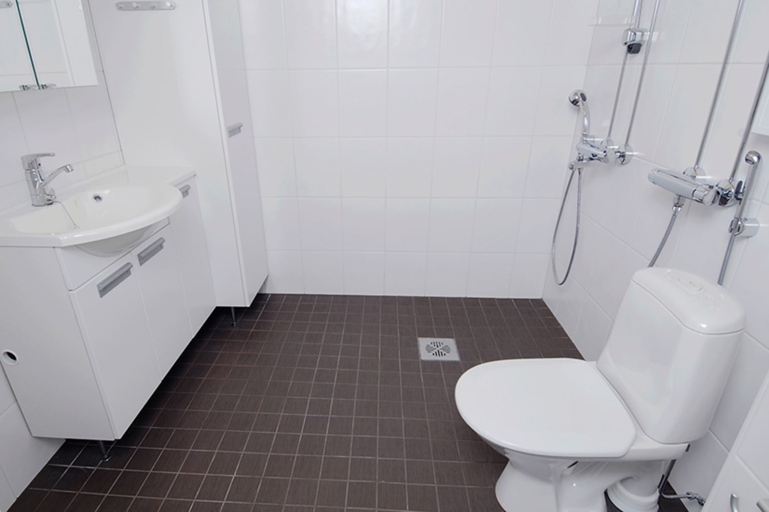 The floors in these units situated in comfortable three-storey buildings are done in varnished oak strip parquet. The bathrooms feature underfloor comfort heating, dark brow-tinted floor tiling and walls done in large white tiles. The understated white kitchenette cabinets are complemented by the dark brown mosaic-tile backsplash and oak laminate countertops. Kitchens are equipped with an UPO ceramic cooker, dishwasher and fridge-freezer, all in white. The studio balconies face northwest, the one-bedrooms have balconies facing either south or southwest.