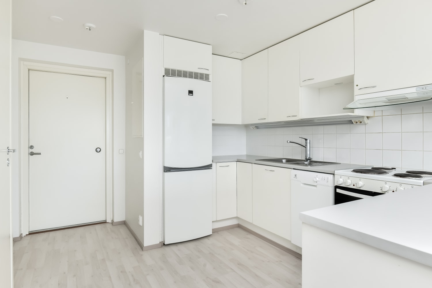 Likusterikatu 1 D is a six-storey building with 60 apartments extending through the building with private access from the communal balcony section. The ground-floor apartments have pleasant wood patios surrounded by planting containers. The glassed-in balconies of the upper floors provide comfortable extra space. The windows and balconies look over the leafy, spacious courtyard with facilities such as a children’s play area. The level of fixtures and fittings is high, and the fresh, light colour scheme and materials create a calm atmosphere. The classy kitchens have a dishwasher. The bathrooms are tiled, and some of the apartments have a private sauna. There is convenient access from the residential floors to the parking facility by lift.