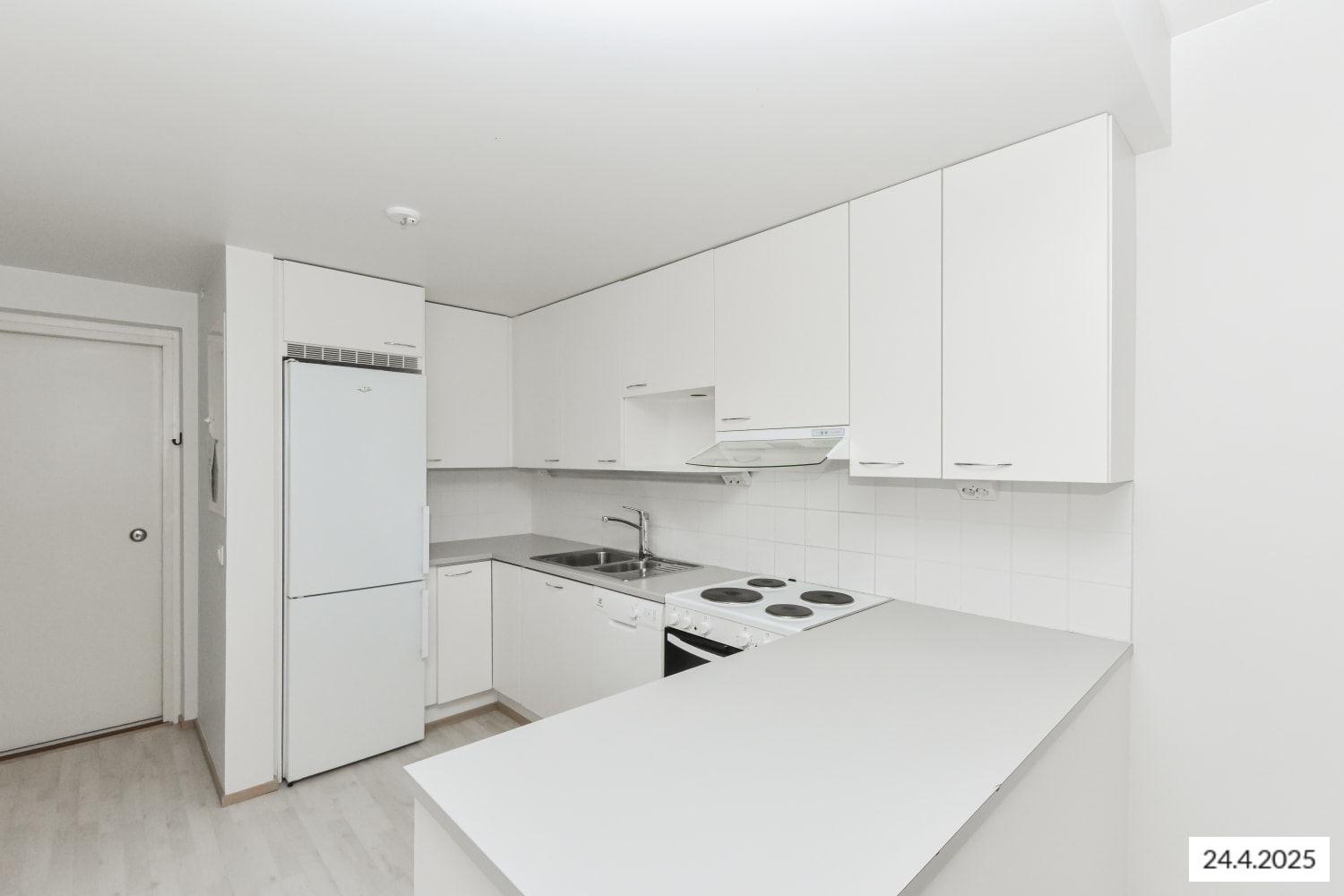 The light-toned home features easy-care laminate flooring. The kitchen cabinet doors are fresh white, with white tiles between the cabinets. The laminate worktop is also light. The kitchen is equipped with a four-burner hob, built-in oven, dishwasher, and refrigeration appliances. The appliances are white.