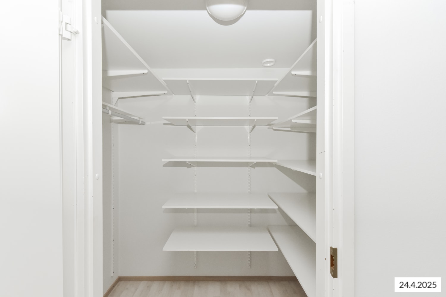 The heart of this beautiful one-bedroom home is the bright living area formed by the kitchen and living room. From the living room, there is access to a sunny glazed balcony. The bedroom comes with a walk-in wardrobe, offering space for clothing storage and even hobby equipment.