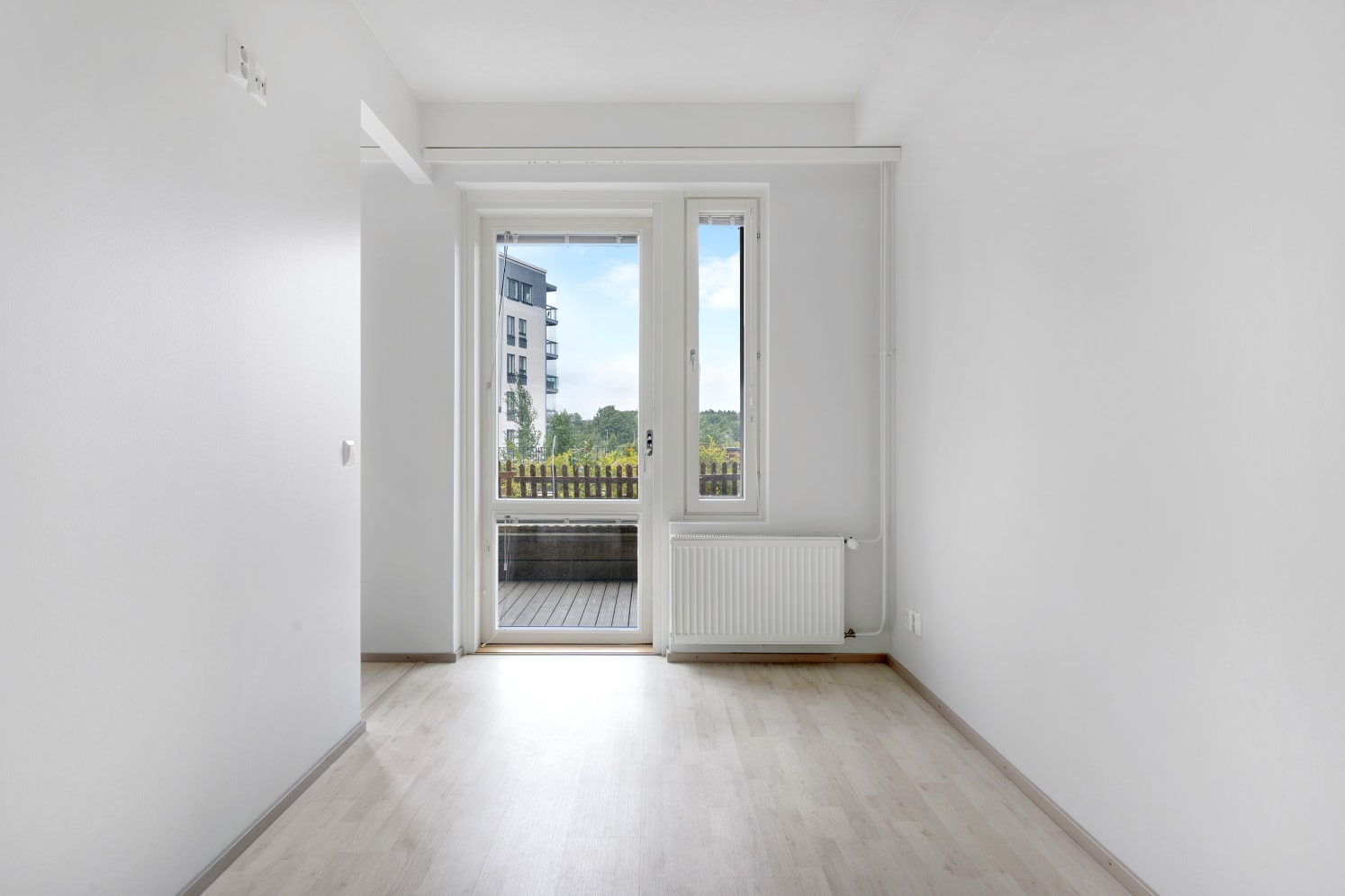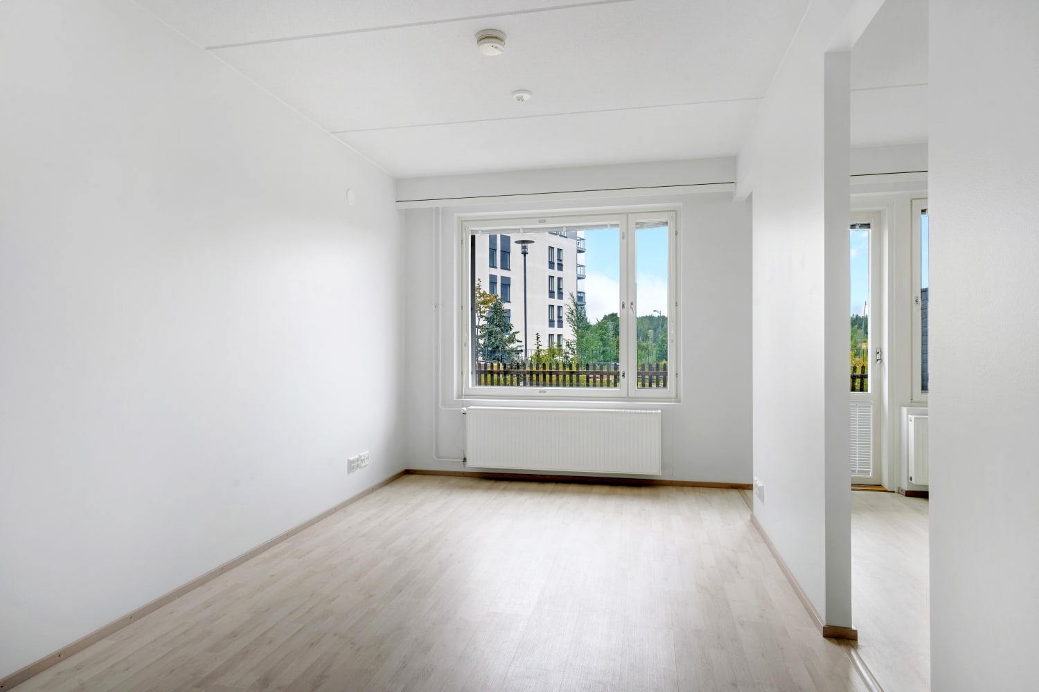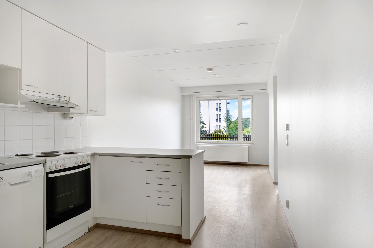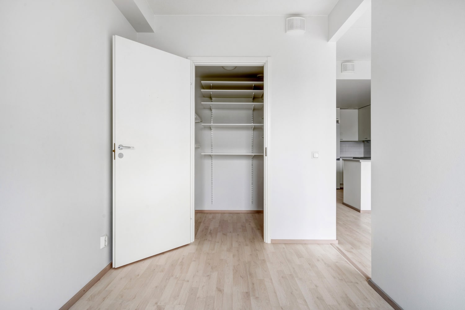 Daily life is easy to organise with storage available in both the entrance hall and a separate walk-in closet in the bedroom. All windows come with Venetian blinds. The flooring is light oak laminate, and the walls are painted in soft, light tones.