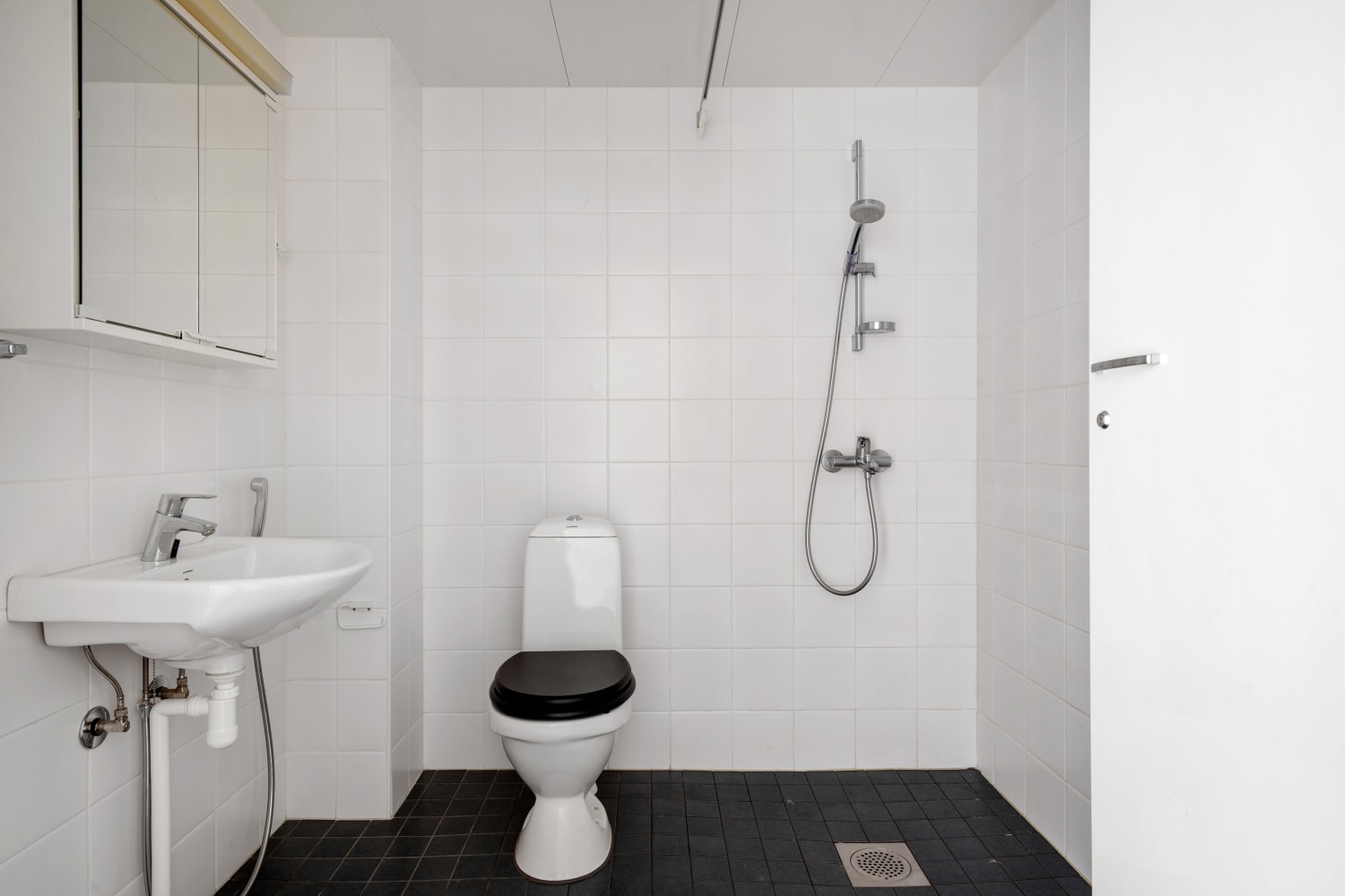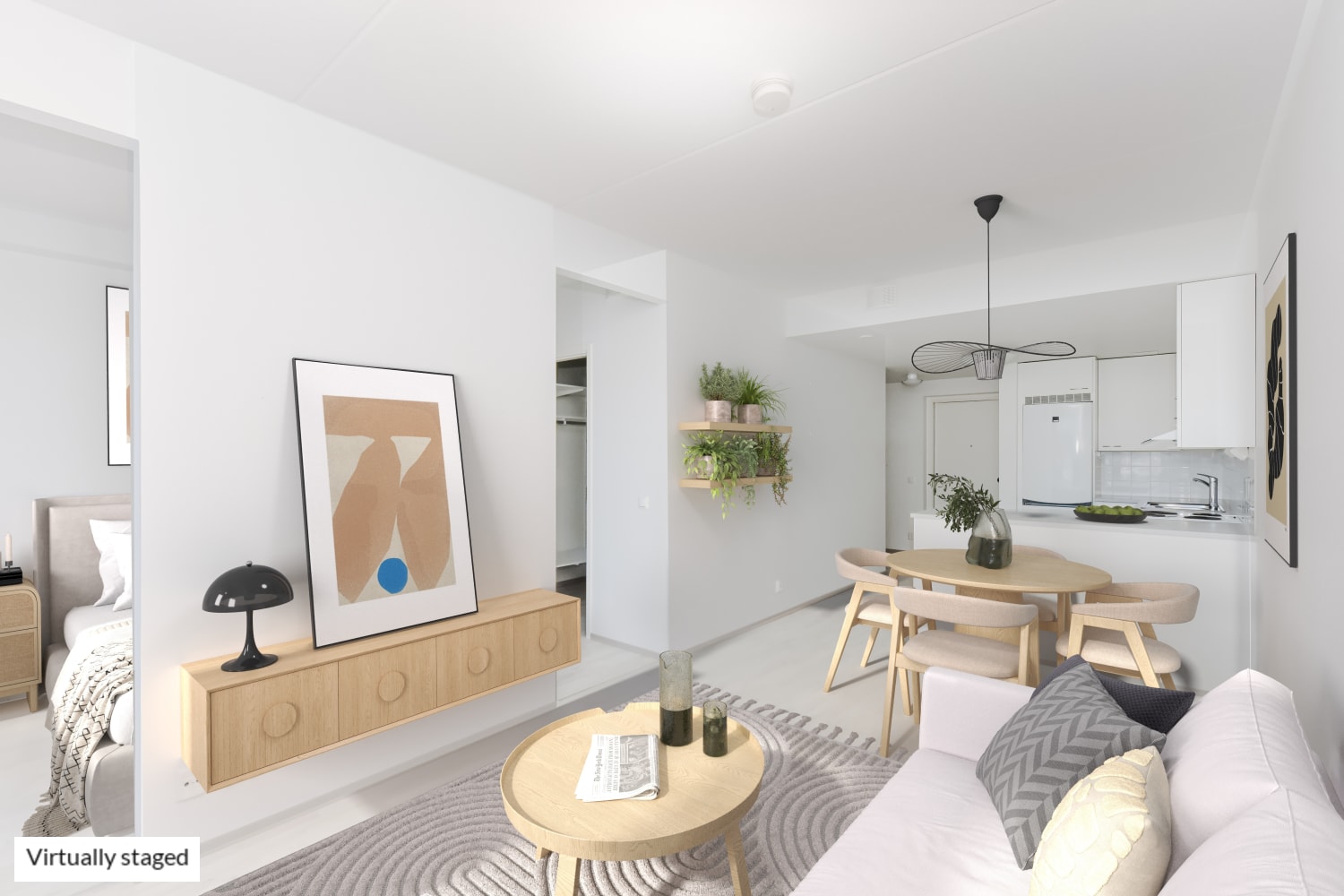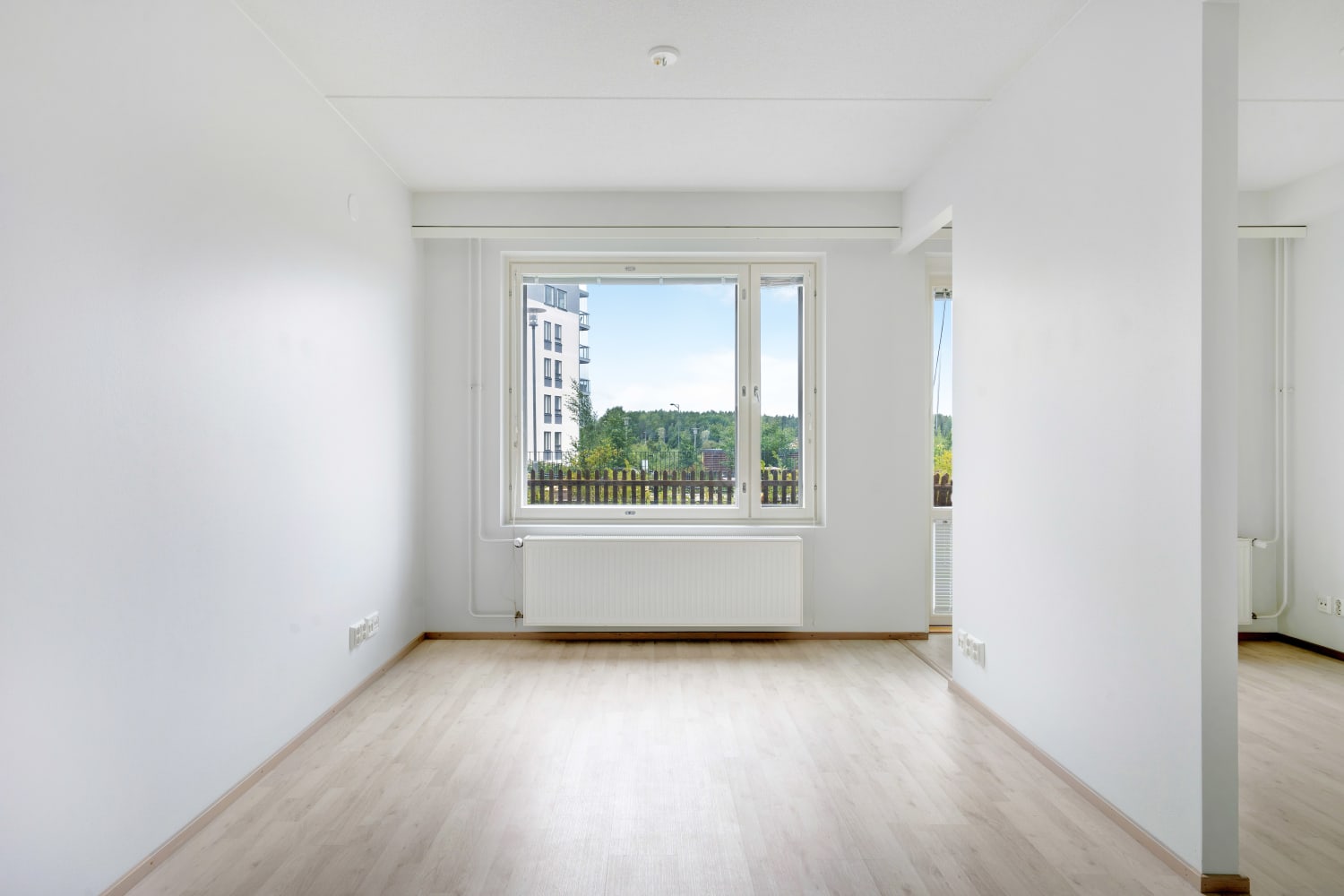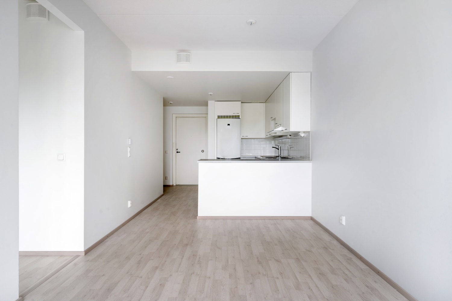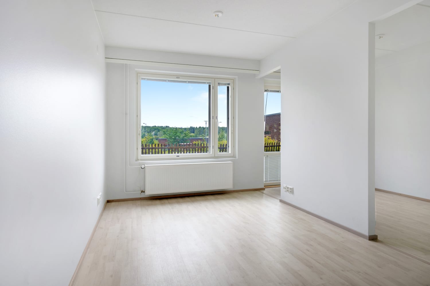 Daily life is easy to organise with storage available in both the entrance hall and a separate walk-in closet in the bedroom. All windows come with Venetian blinds. The flooring is light oak laminate, and the walls are painted in soft, light tones.