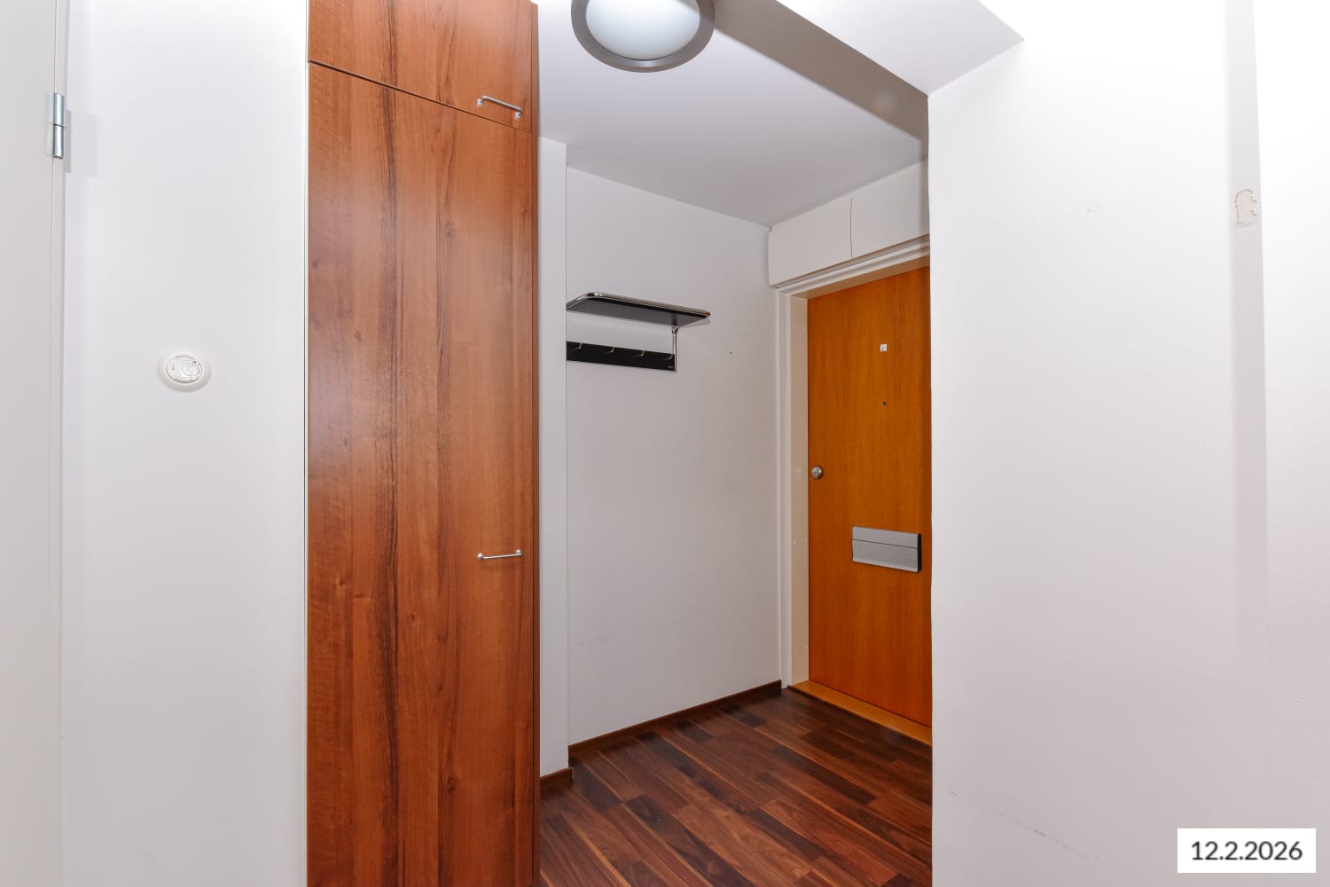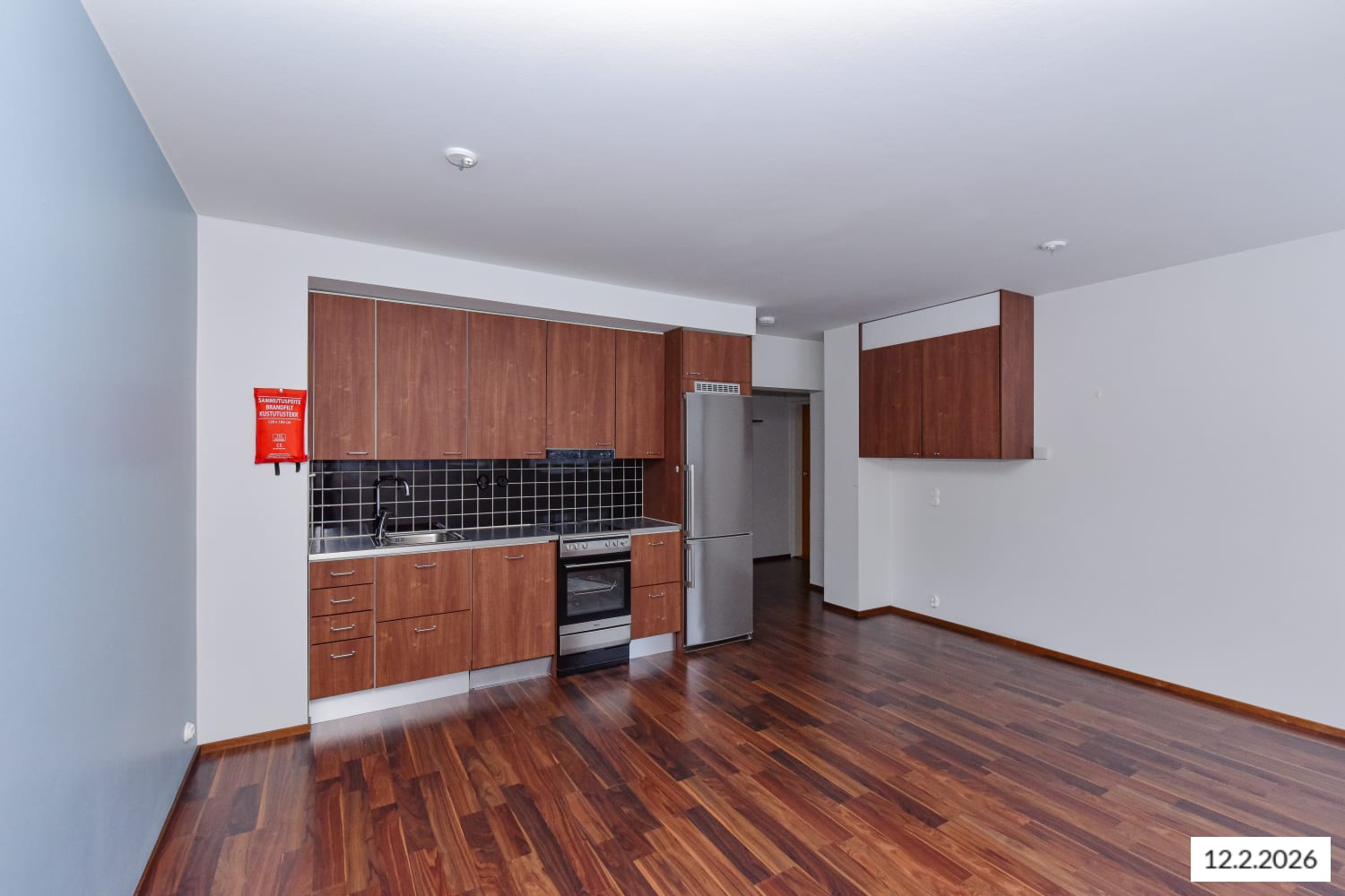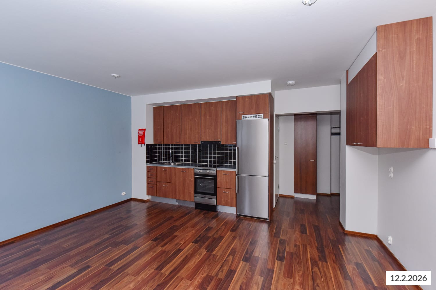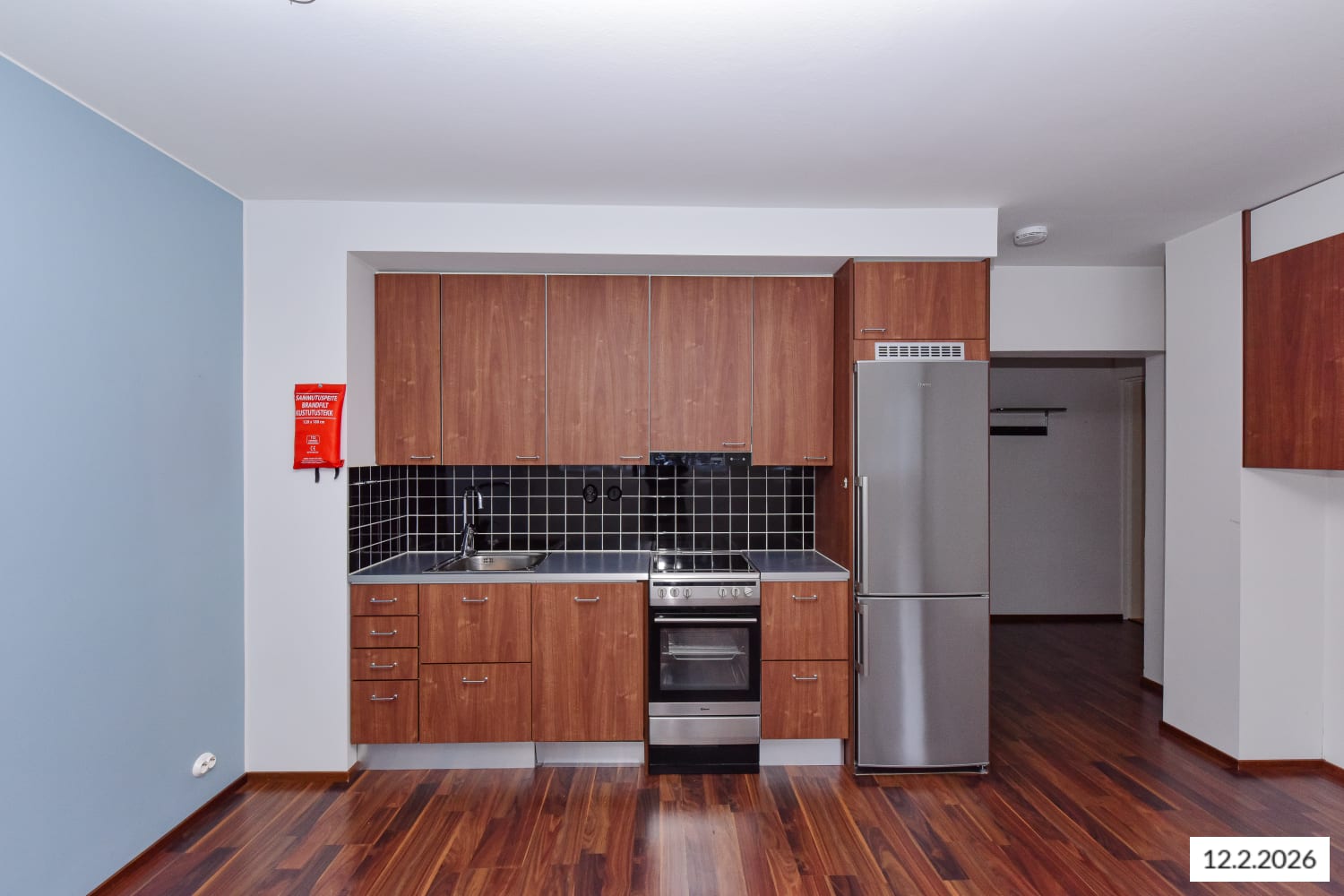 The apartment features walnut-coloured laminate flooring, with mostly white walls complemented by a light blue accent wall. The kitchenette cabinets are walnut-coloured, and the space between the upper and lower cabinets is tiled with glossy black tiles. The worktop is black-patterned laminate. Kitchen amenities include a stainless steel freezer-refrigerator, ceramic hob and extractor hood, integrated dishwasher, and provision for a microwave oven.