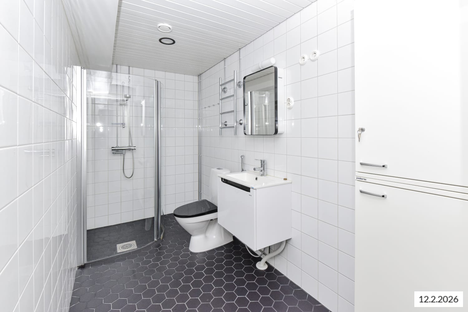 The black and white bathroom walls are tiled with glossy white tiles, while the floor is covered with hexagonal, matte black tiles. There is provision for a washing machine and tumble dryer.
