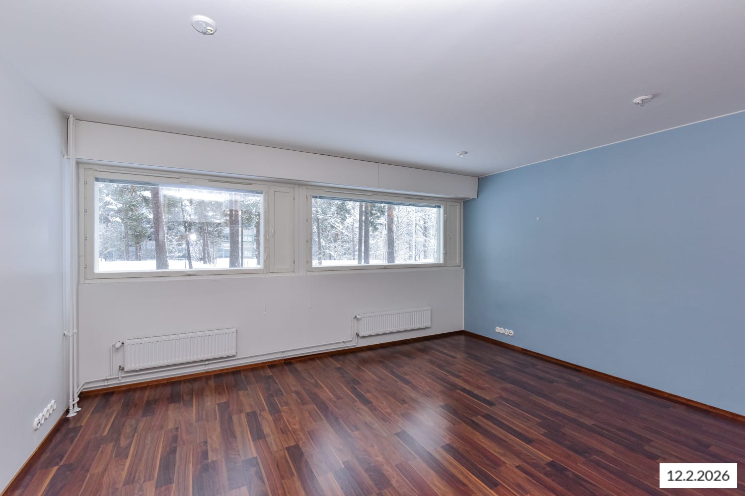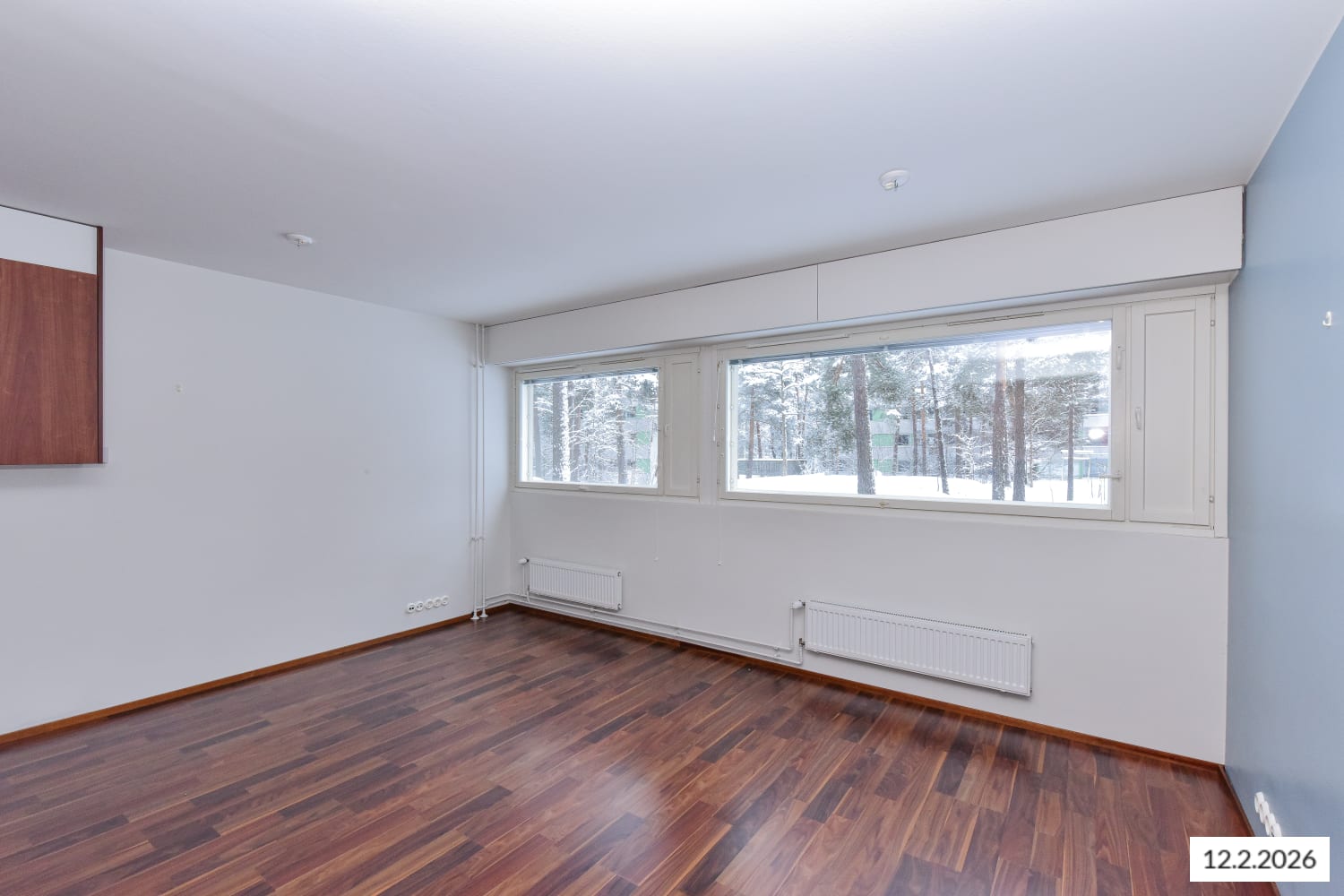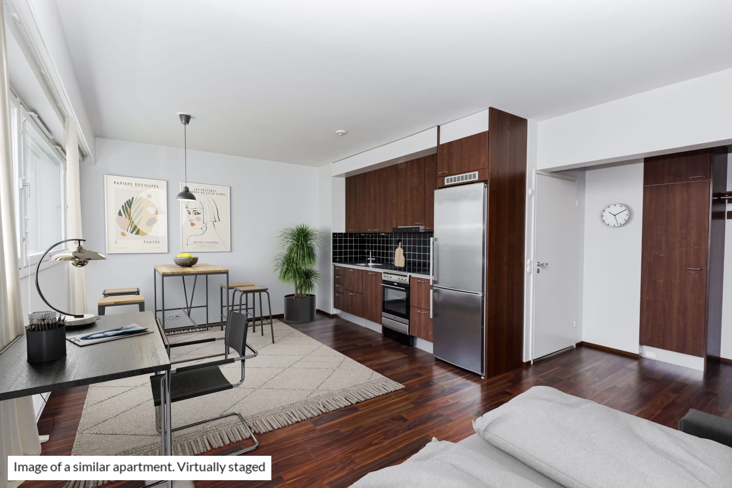 This compact home, facing the morning sun, is flooded with light through large windows that span the width of the apartment. The kitchen units are neatly arranged along one wall, making it easy to furnish the living area to your liking.