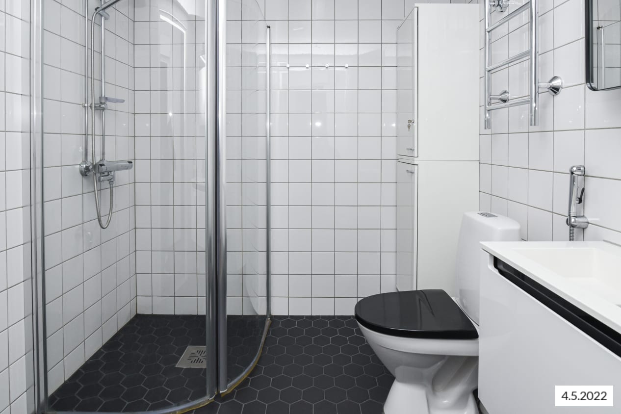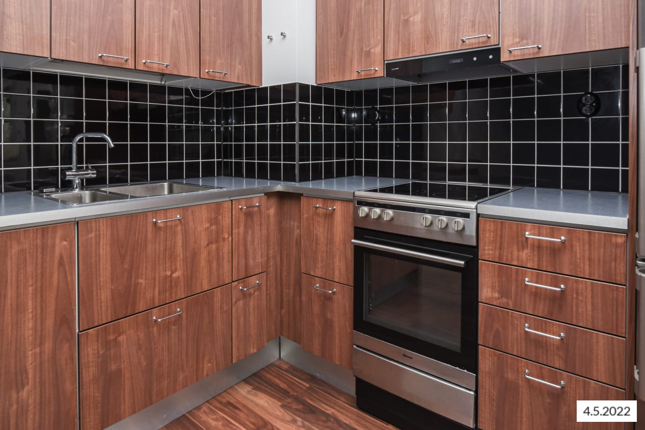 The apartment floors are walnut-coloured laminate, and the otherwise white walls are enhanced by a feature wall with a hint of light blue. The kitchenette cabinets are walnut-toned, and the space between the upper and lower cabinets is tiled with shiny black tiles. The worktop is black patterned laminate. The kitchen is equipped with a stainless steel freezer-refrigerator, ceramic hob and cooker hood, an integrated dishwasher, and provisions for a microwave.