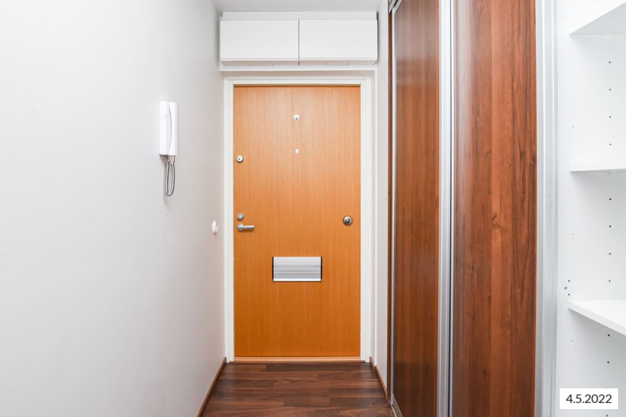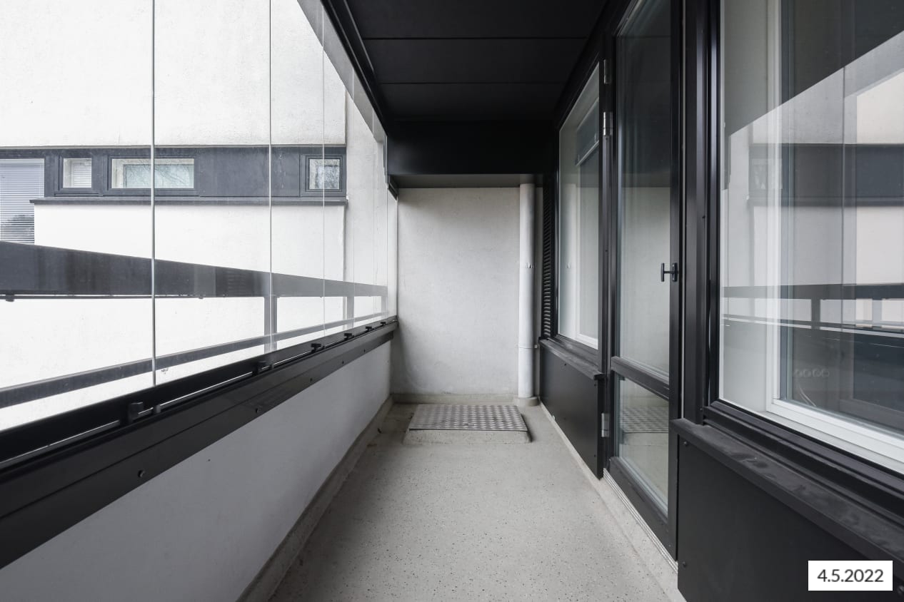 The efficient one-bedroom home features kitchen fittings placed in the corner of the living room, making it easy to furnish a small dining area in the same space. The bedroom is separated from the hallway with a practical sliding door. The living room offers access to the west-facing glazed balcony, which is a lovely spot to relax even on cooler evenings.