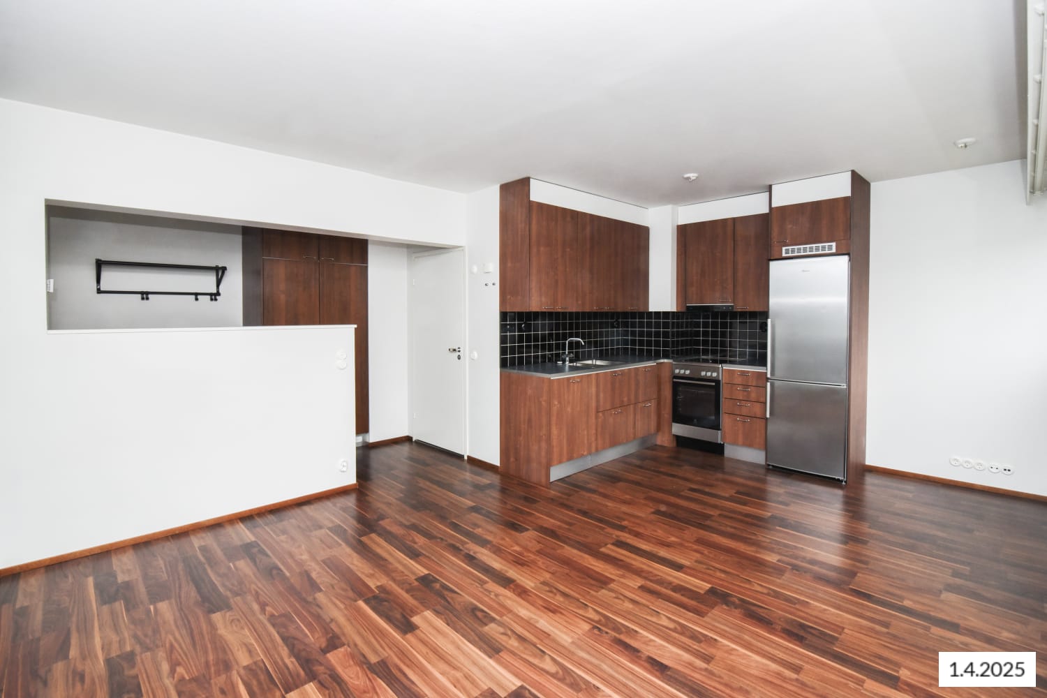 The apartment floors are walnut-coloured laminate, and one light blue accent wall livens up the otherwise white walls.