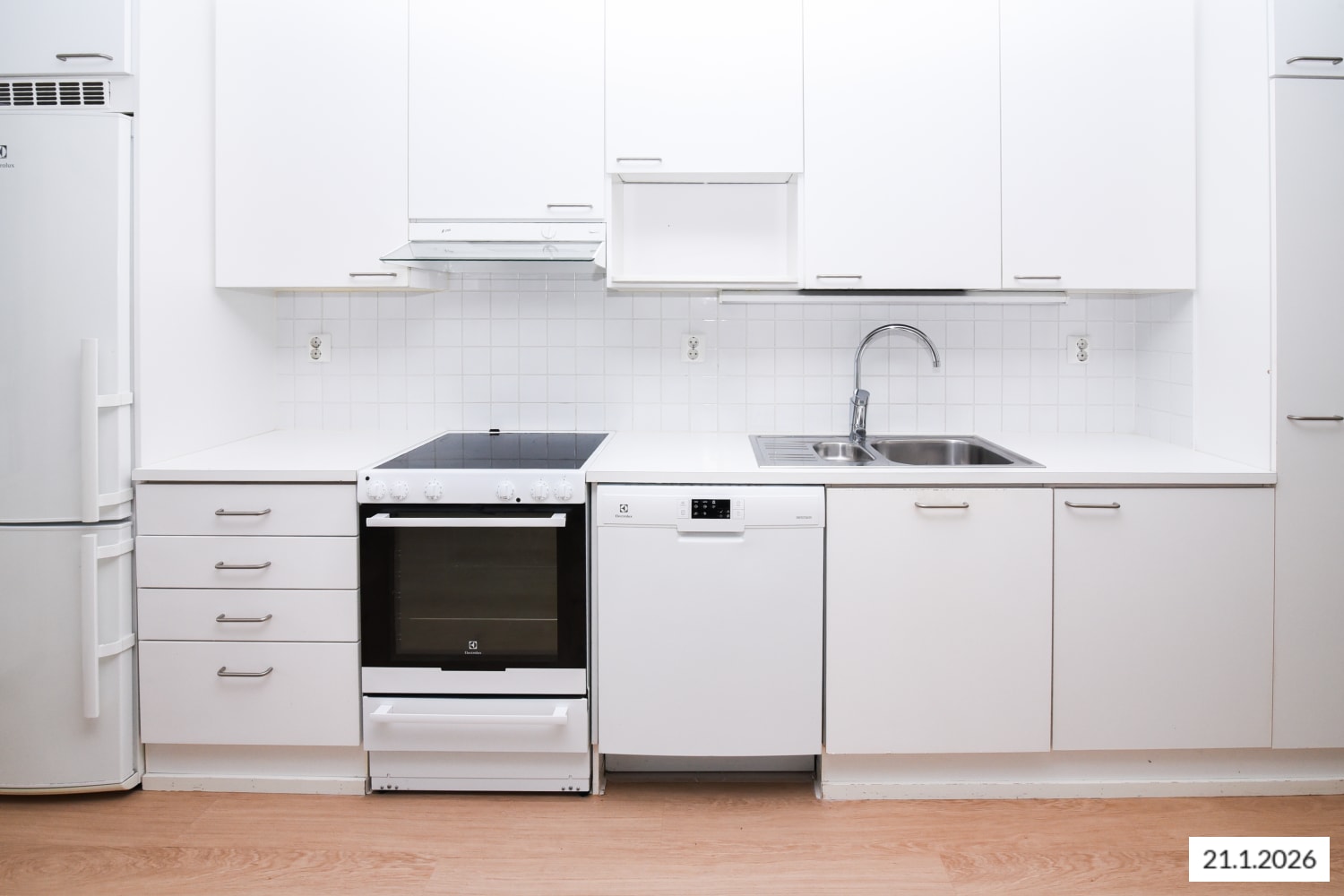 The homes feature bleached oak laminate flooring and bathrooms of understated elegance tiled in dark grey, white and black. The kitchen cabinetry is white, backsplashes are done in textured white square tile, and the clean and crisp look is rounded out with white laminate countertops. Kitchens are equipped with a ceramic cooker, dishwasher and fridge-freezer. The windows have Venetian blinds.