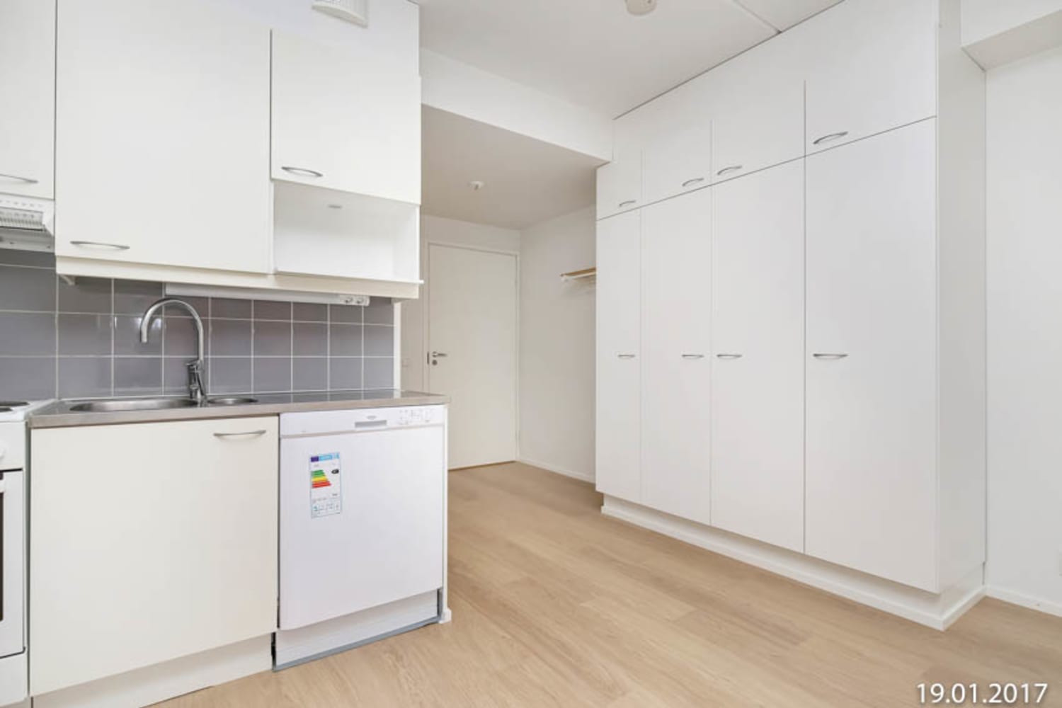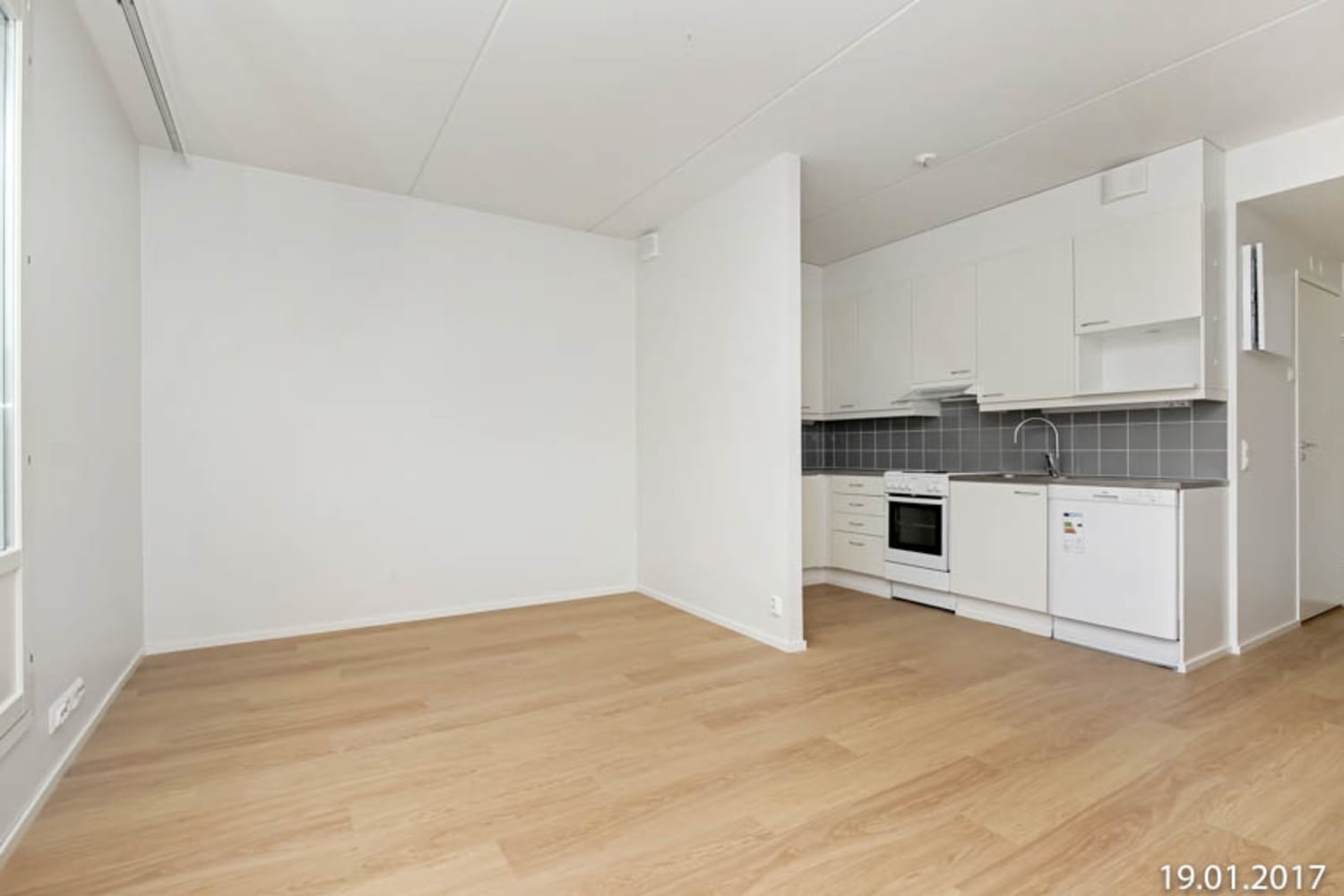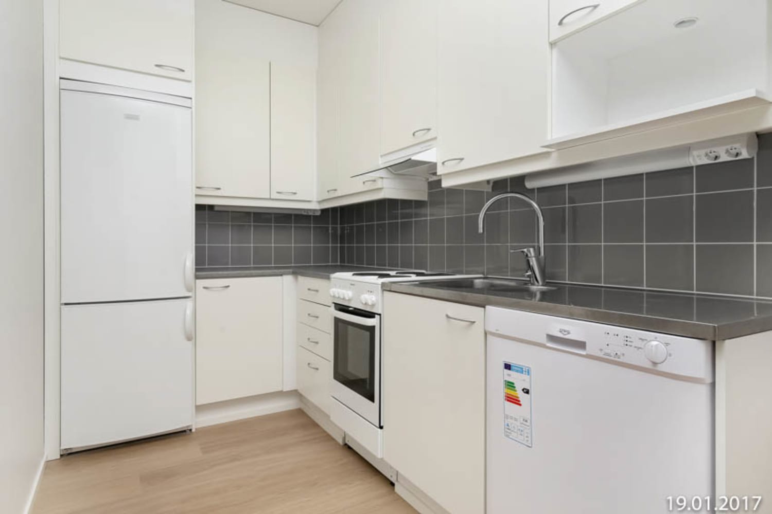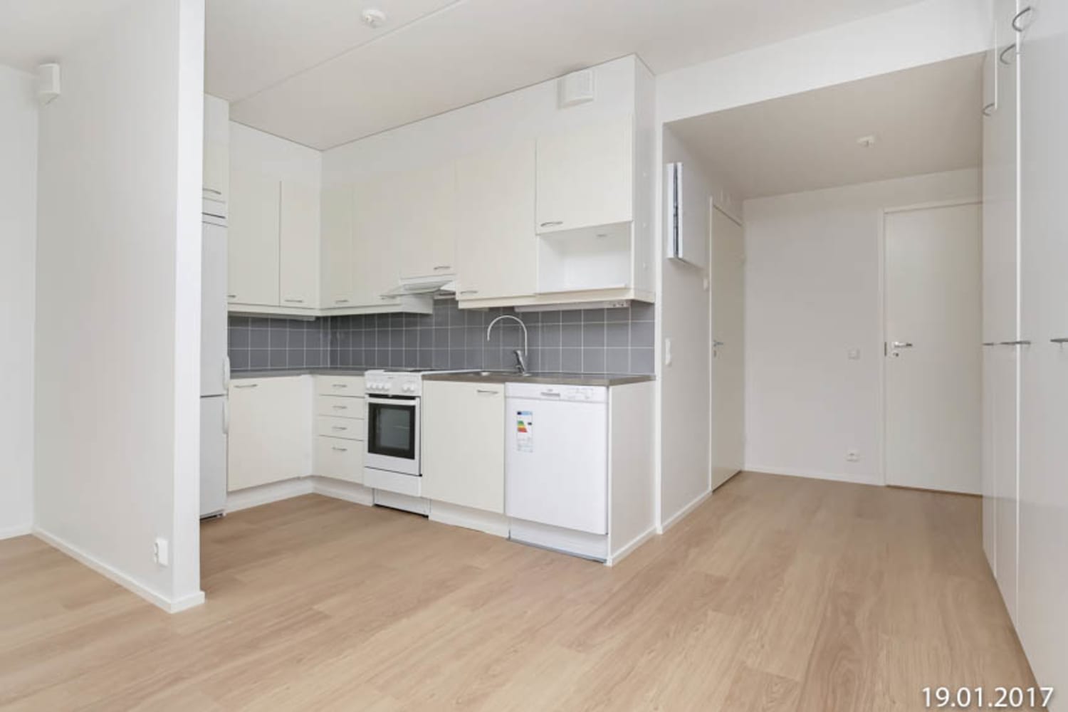 The clear L-shaped kitchen space is equipped with a dishwasher for the home chef's delight. The spacious bathroom has room for a washing machine and a convenient laundry cupboard.