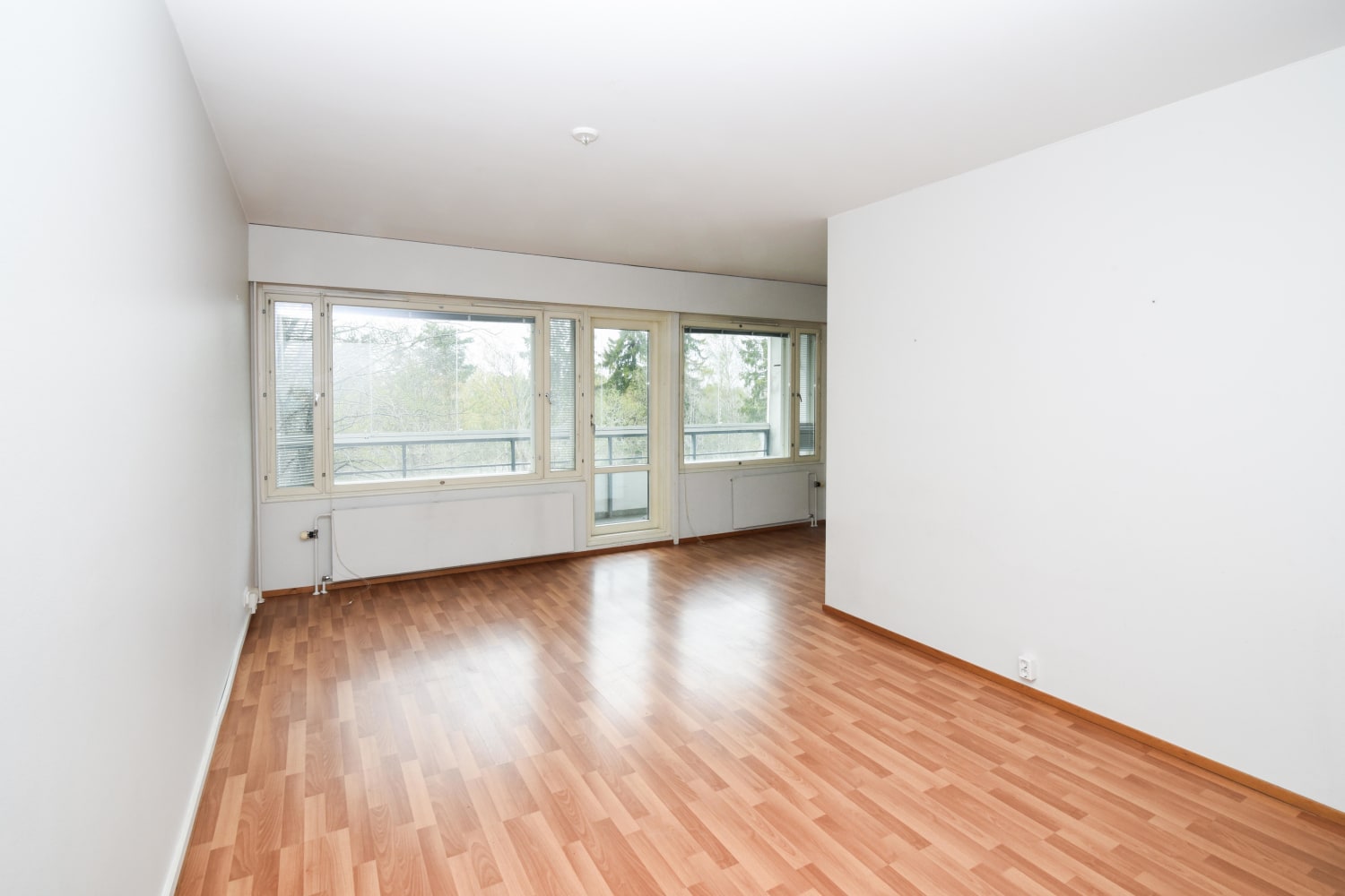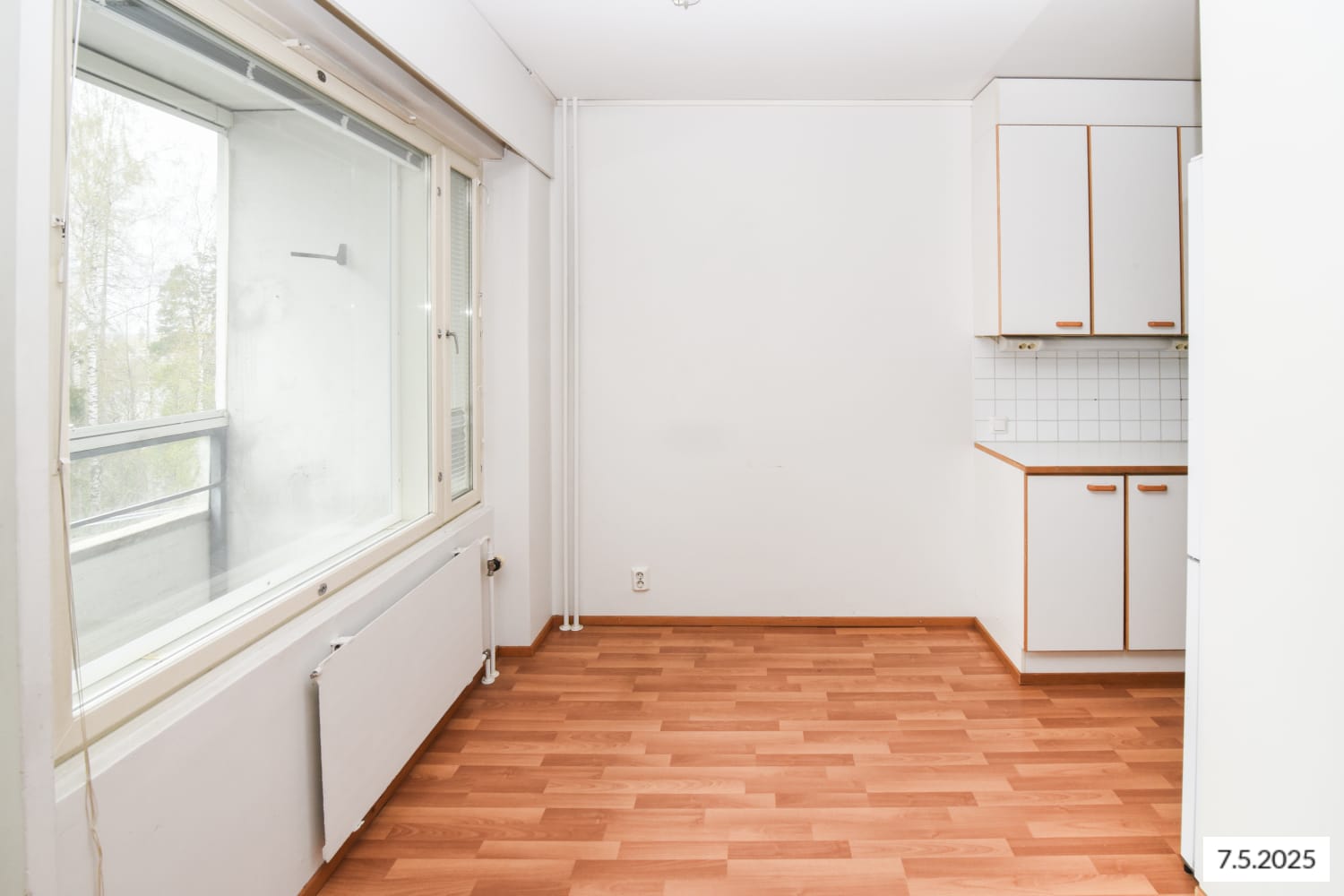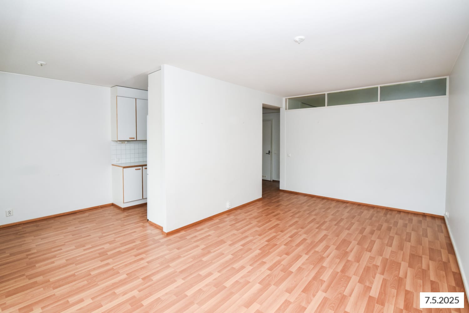 The windows of this well-designed one-bedroom home open in two directions, bringing natural light into the interior. The floor is easy-care laminate and the walls are painted white. The living room can be easily decorated to suit your taste. In summer, the space extends to a spacious glazed balcony.