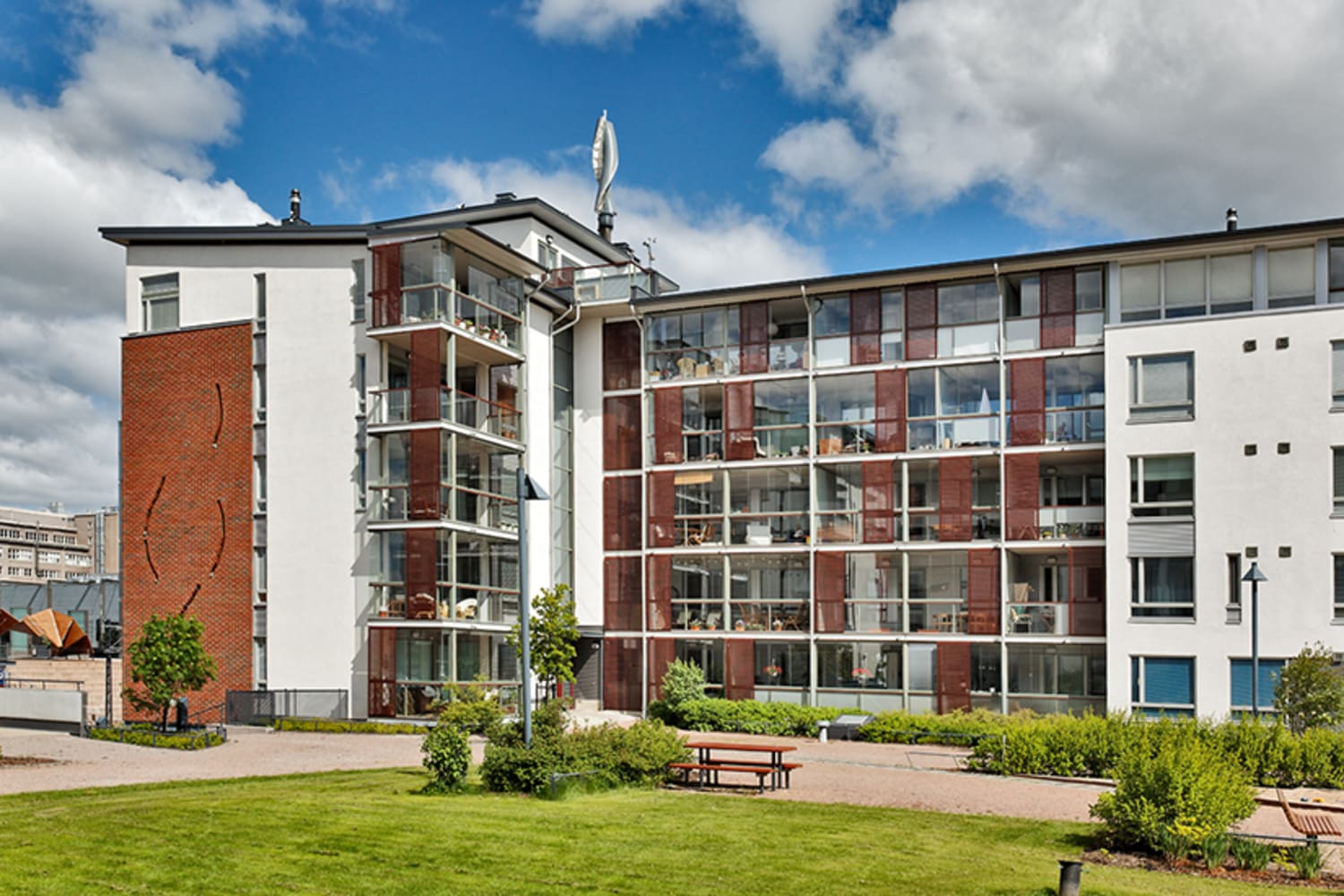 The homes are equipped with a heat recovery forced air ventilation systems which may be adjusted individually for each home. The balconies of the 45 sqm homes open onto the spacious yard towards the southwest while the 39 sqm homes have balconies opening west on Kaj Franckin aukio square. The balconies have clear-glass railings fitted with blinds.