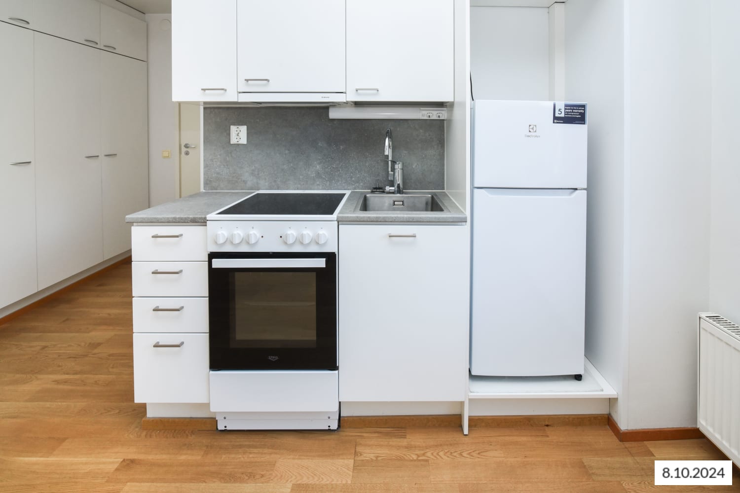 In a popular residential area by the shore of Vanhankaupunginlahti, a neat and beautiful studio awaits its new residents. The open kitchen ensures that no space is wasted in the living room. The bathroom is stylishly tiled, and both the living room and hallway feature a beautiful parquet floor. The kitchen is equipped with refrigeration appliances, an oven, and a newly updated stove.