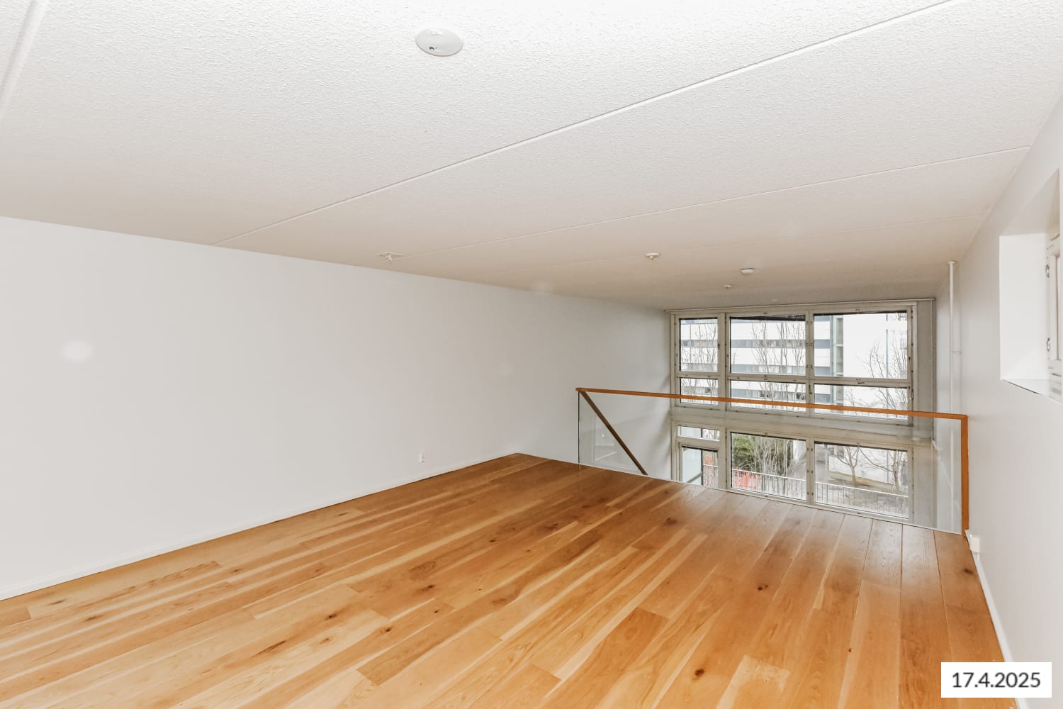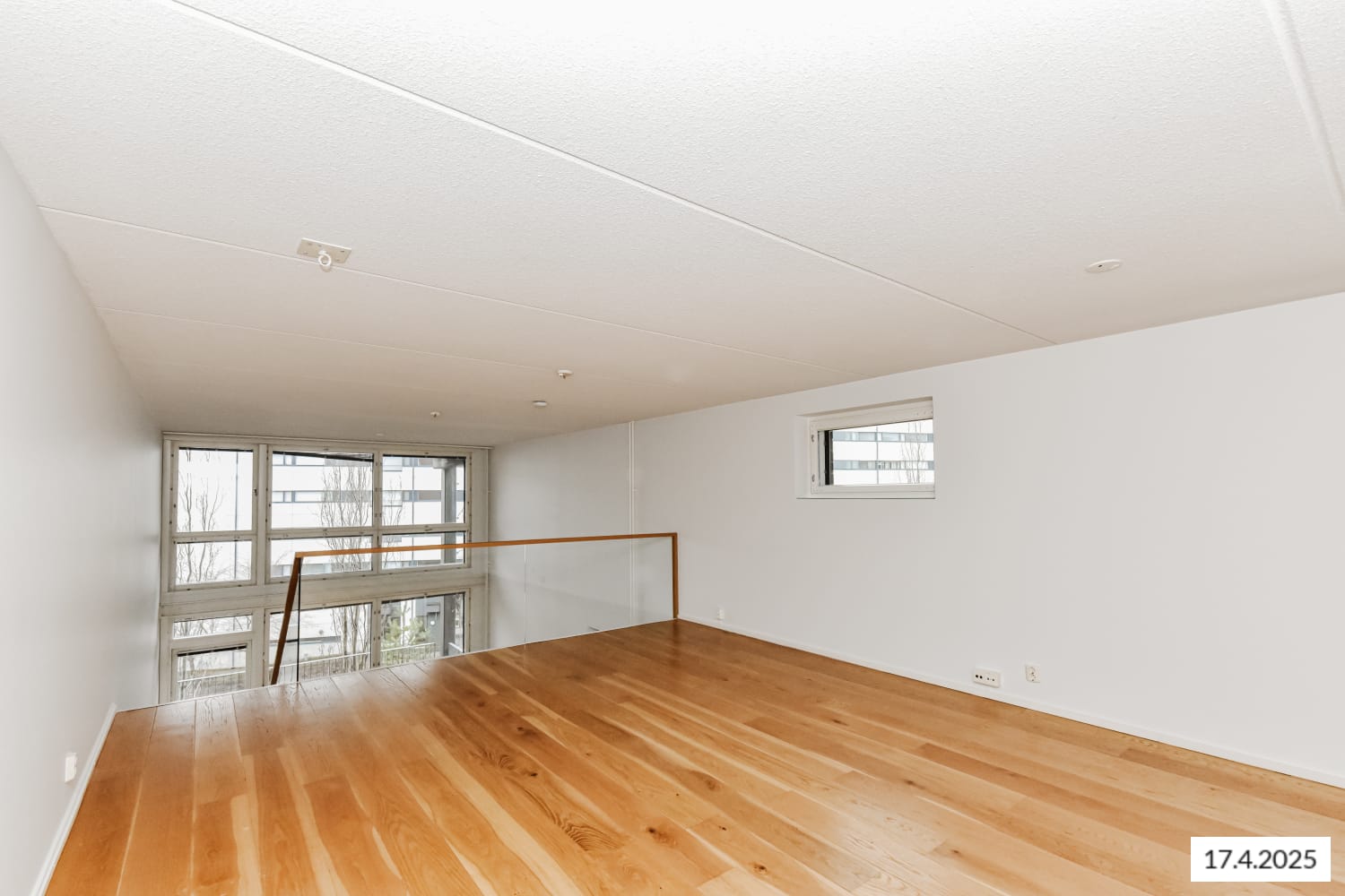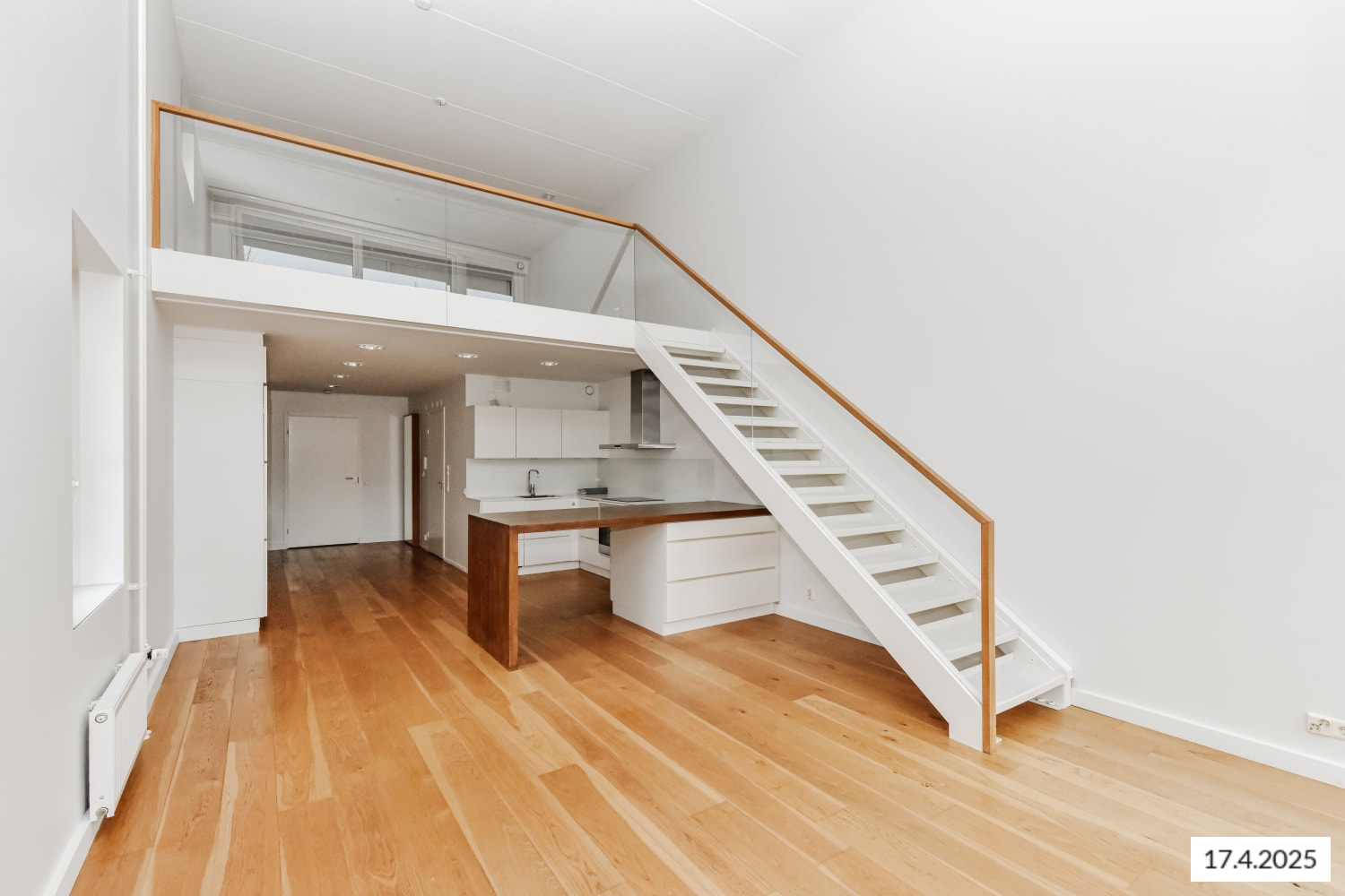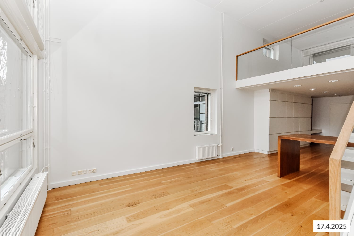 Rare opportunity! This ruggedly modern apartment building located at the north end of Arabianranta houses unique loft homes. The ceiling height of this home is approximately five metres, featuring a distinctive mezzanine level. The sense of space and openness is enhanced by floor-to-ceiling windows covering the entire wall.