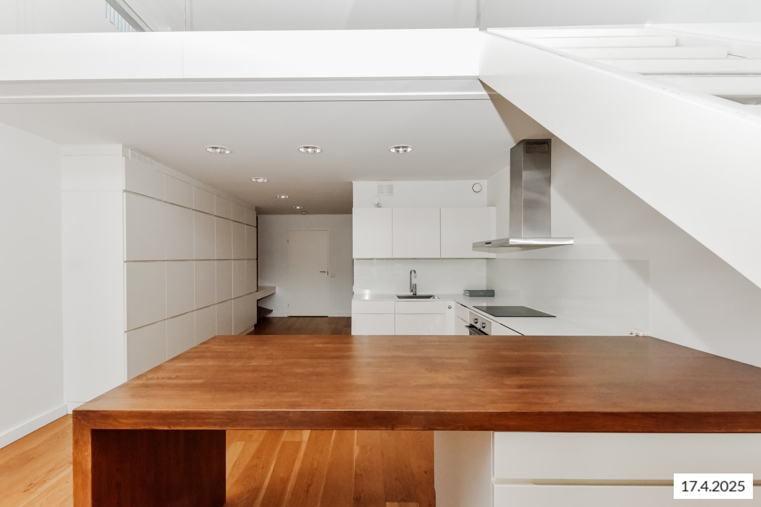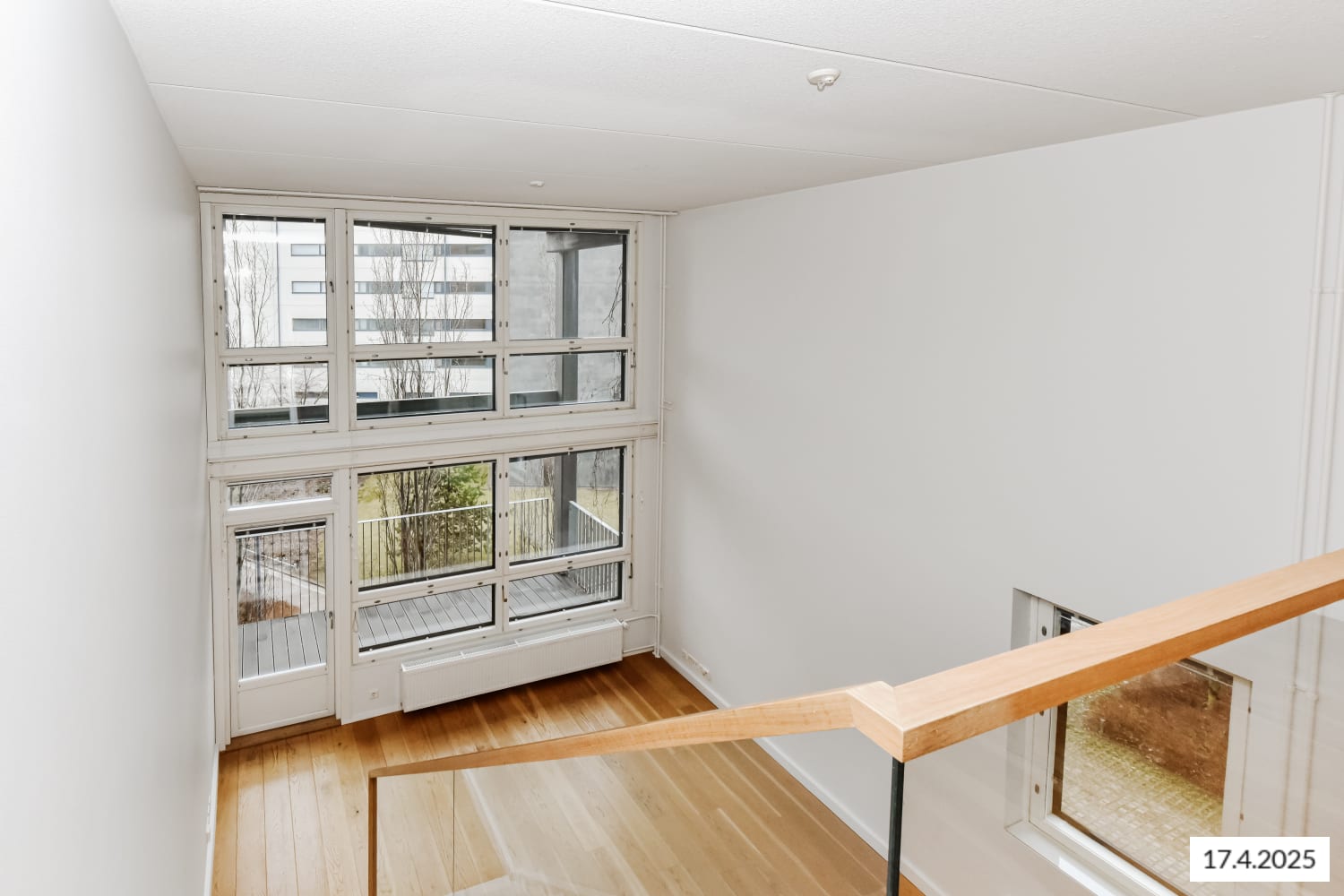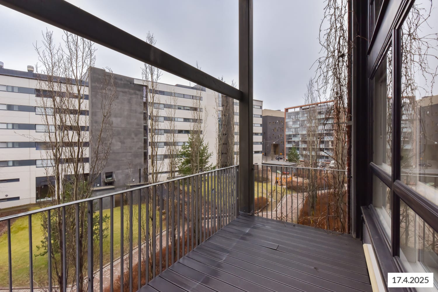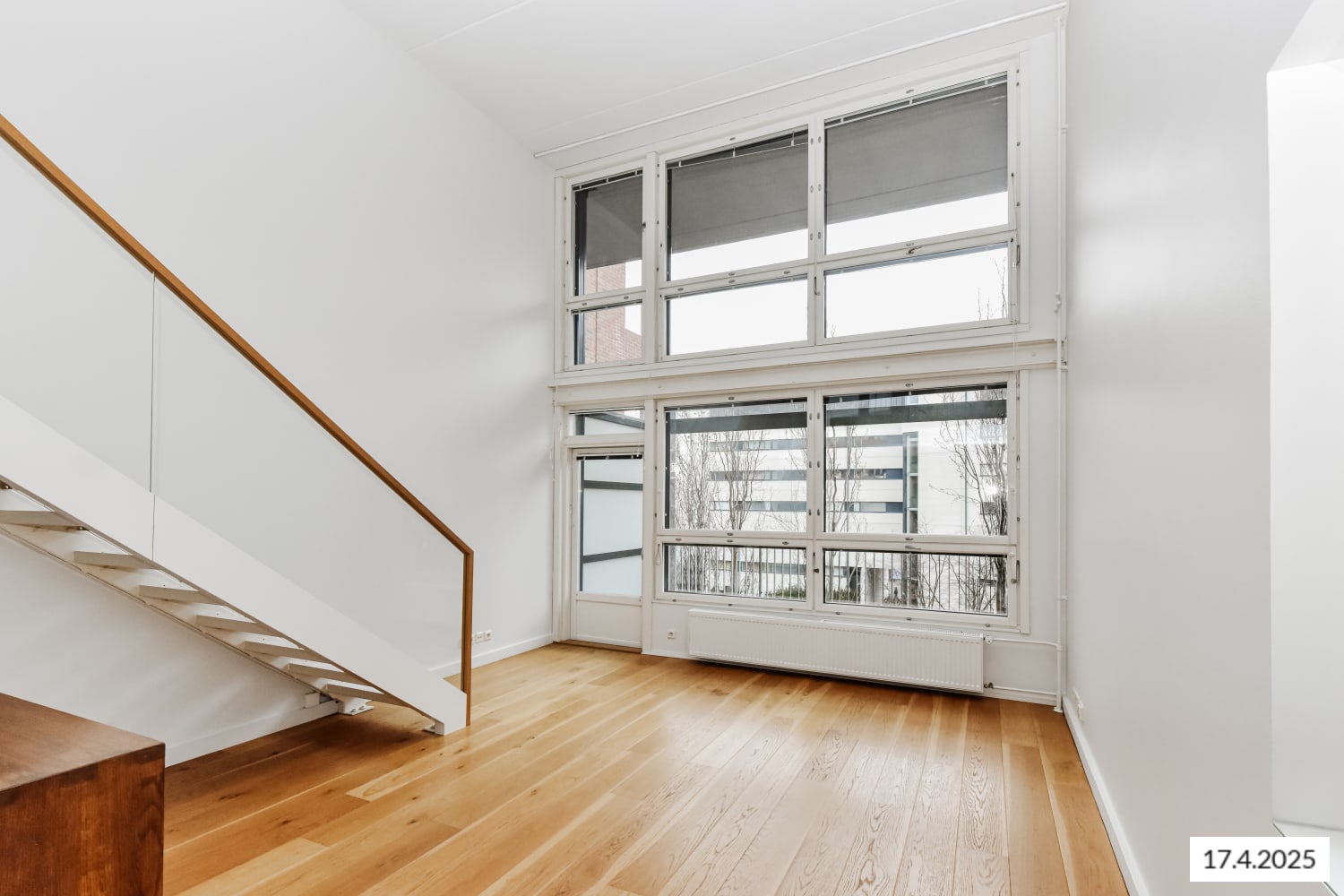 Rare opportunity! This ruggedly modern apartment building located at the north end of Arabianranta houses unique loft homes. The ceiling height of this home is approximately five metres, featuring a distinctive mezzanine level. The sense of space and openness is enhanced by floor-to-ceiling windows covering the entire wall.