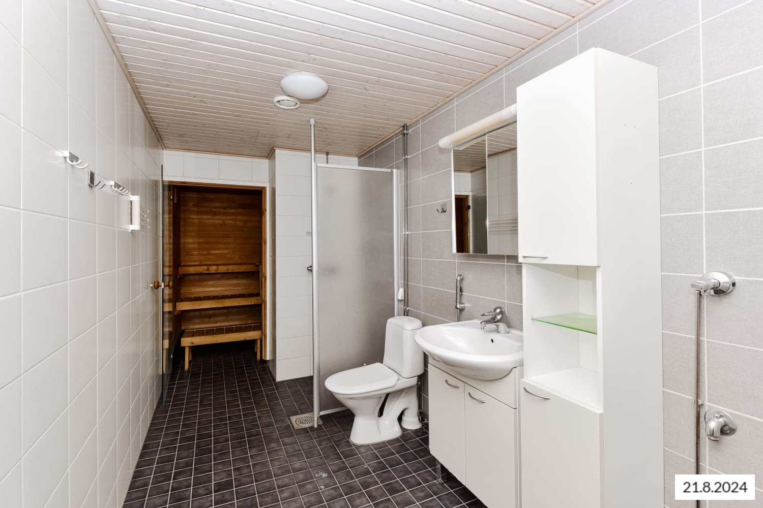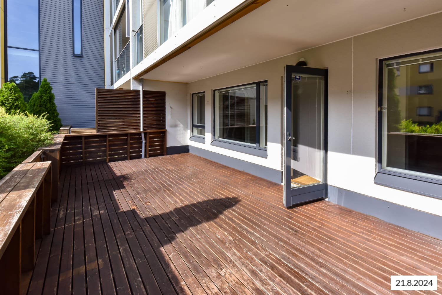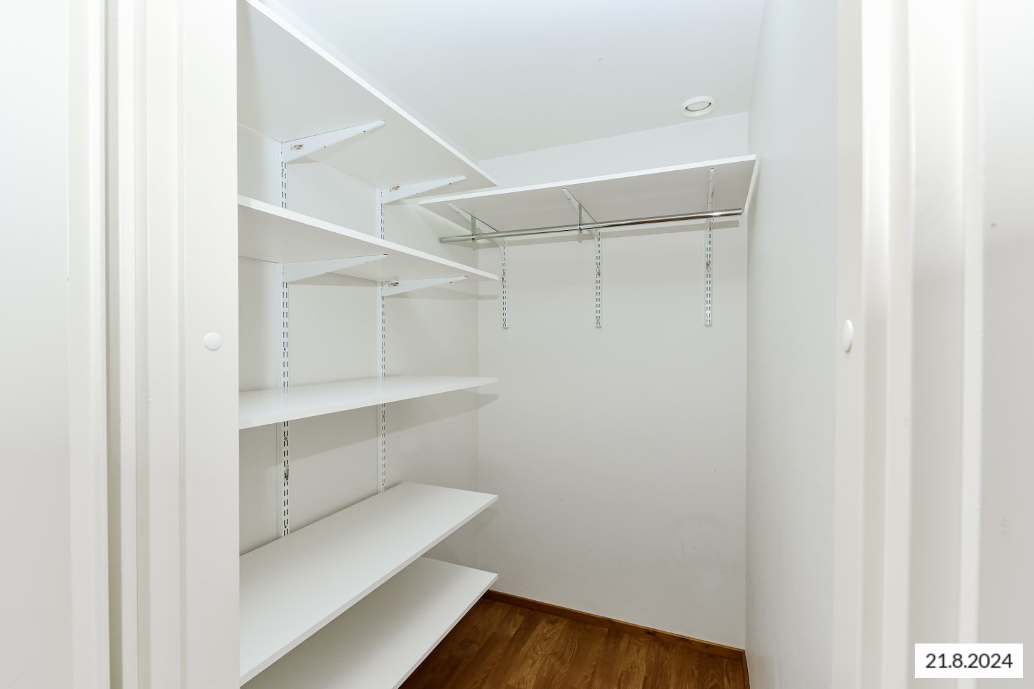 This cozy one-bedroom apartment offers a warm atmosphere with light-colored materials that suit the Finnish taste, complemented by a wonderfully large south-facing patio. The living areas feature light oak laminate flooring. In the bathroom, the dark gray tiled floor has underfloor heating, while the walls are tiled in white, with a stylish accent wall of textured light gray tiles laid horizontally. The kitchen has white upper cabinets and dark gray lower cabinets. Standard appliances include a dishwasher, fridge-freezer, and a ceramic stove, perfect for any home cook.
