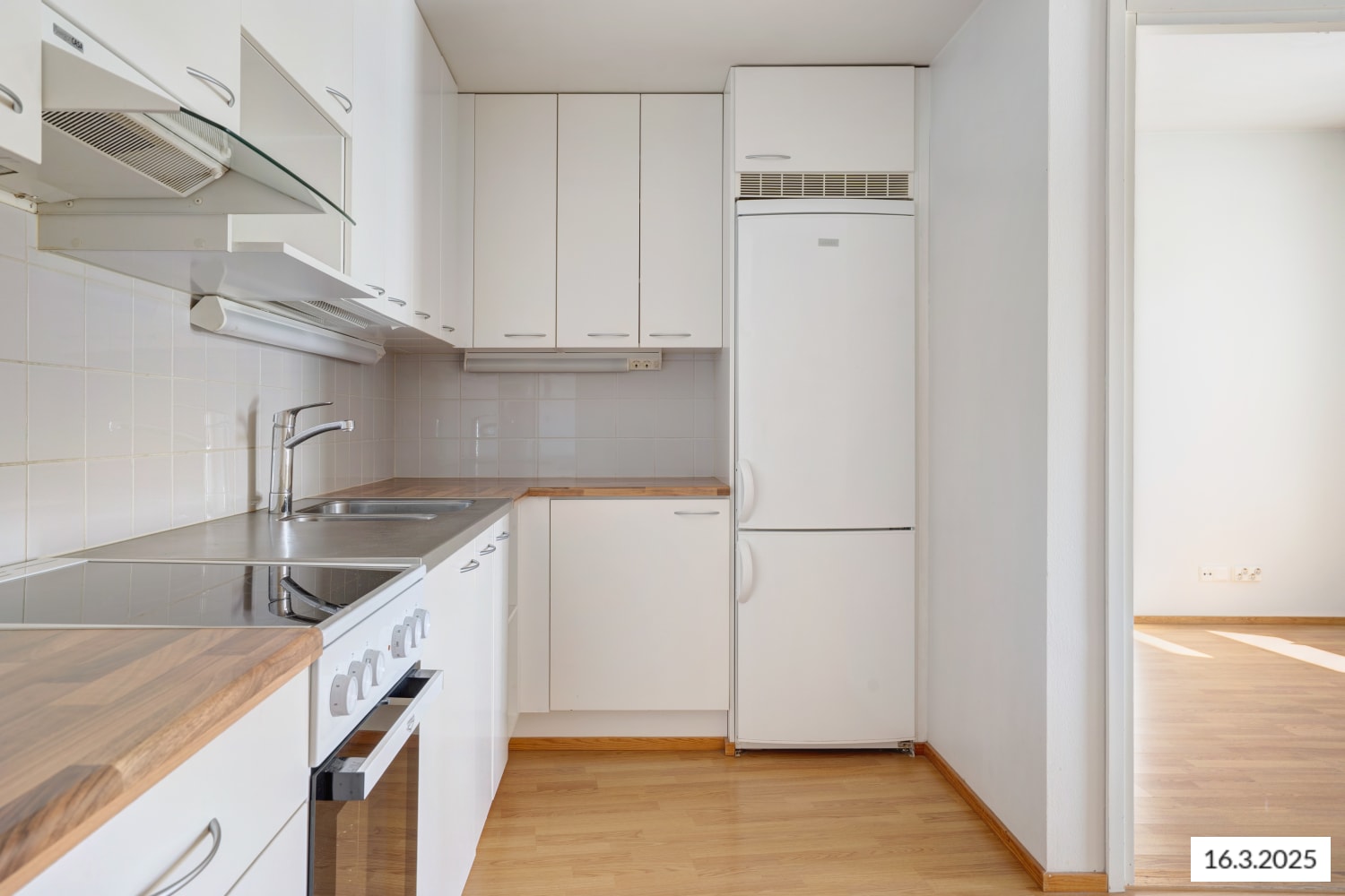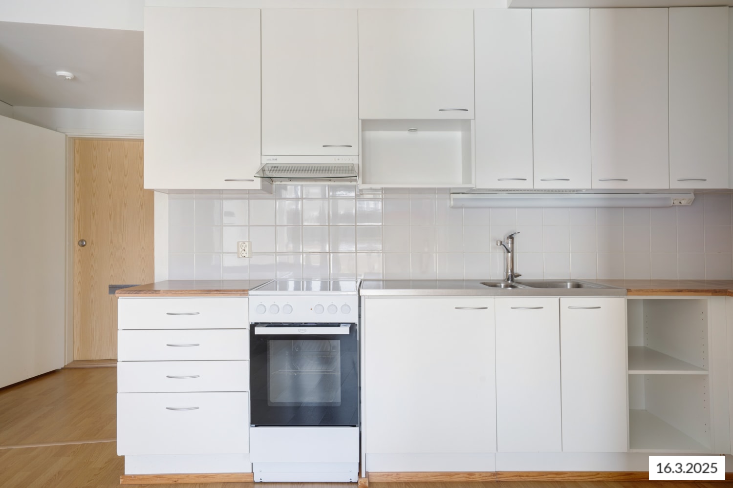This light-toned home features an efficient, well-planned layout where the living room seamlessly connects with the kitchen, creating a spacious and inviting area. The kitchen includes space for a dishwasher, while storage solutions are well thought out, with closets in the hallway and a generously sized walk-in wardrobe next to the bedroom.