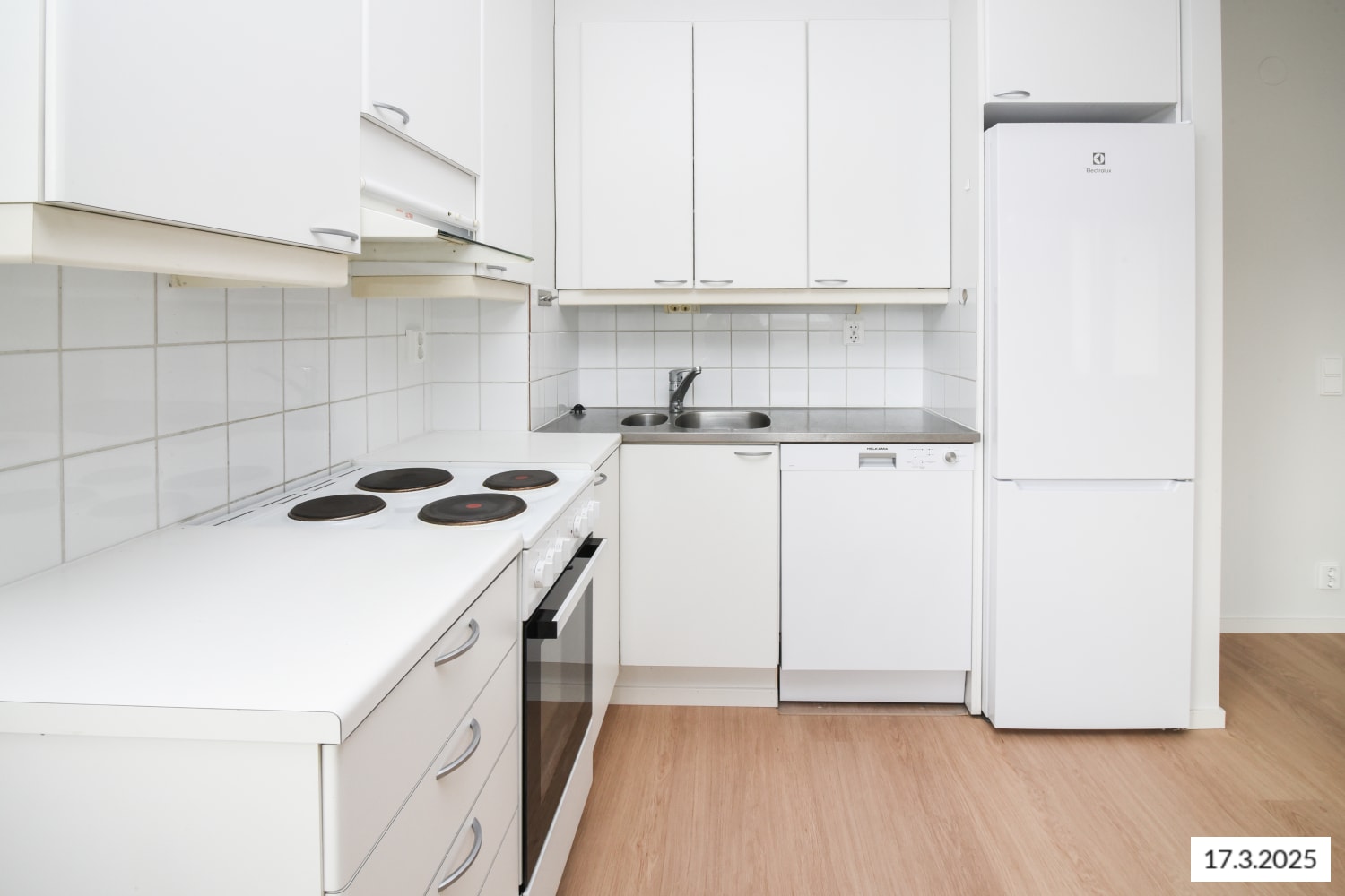 The living areas, kitchen, and hallway feature elegant oak plank parquet flooring, while the bathroom is fully tiled. The kitchen is equipped with a dishwasher, floor oven, stove, range hood, and fridge-freezer.