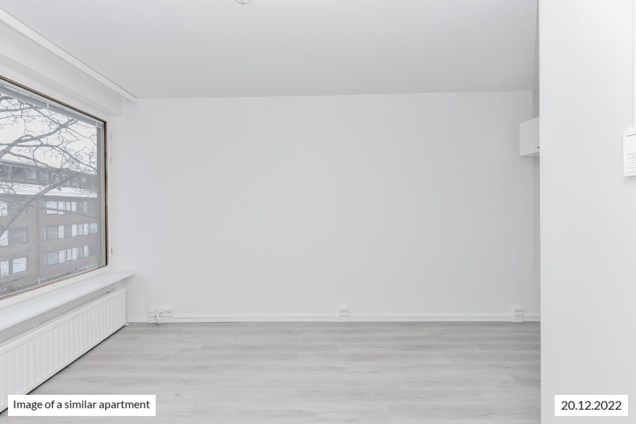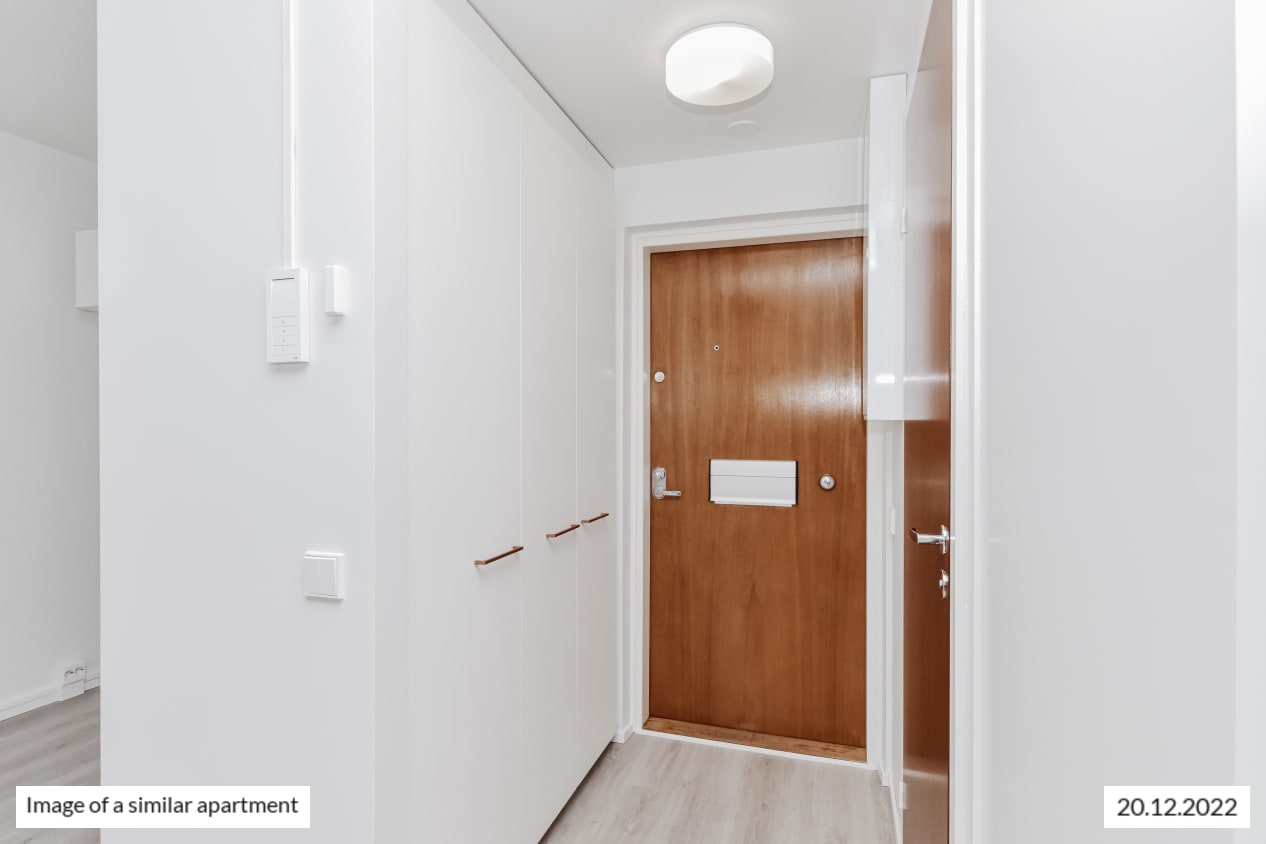 This fully renovated little home feels larger than its square meterage would imply thanks to the large windows spanning the entire width of the living room and the balcony facing the evening sun. The smart 1950s layout is functional in terms of its proportions, and the charming apartment is easy to furnish in many ways. The set of wardrobes in the entrance hallway creates an alcove in the living area where you can set up a sleeping nook that looks just right for you.
