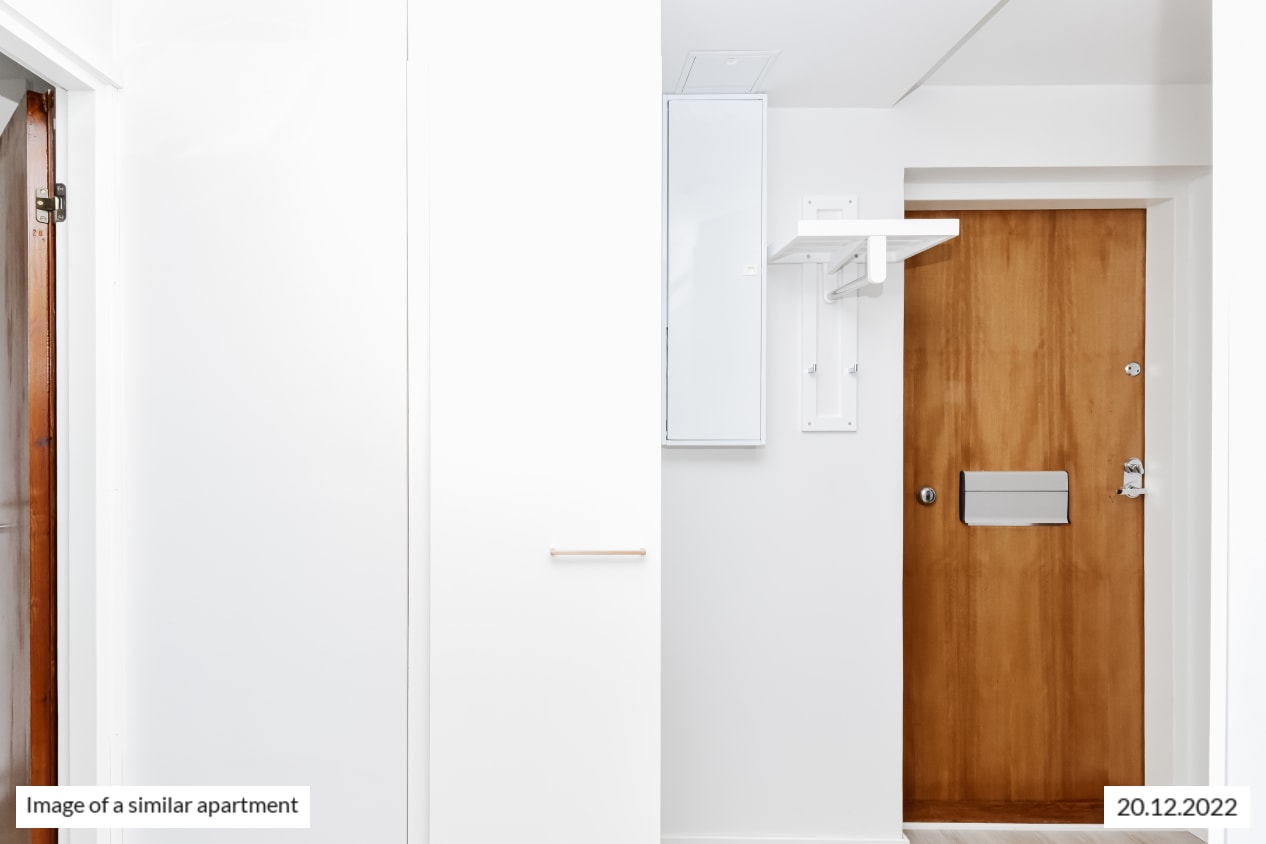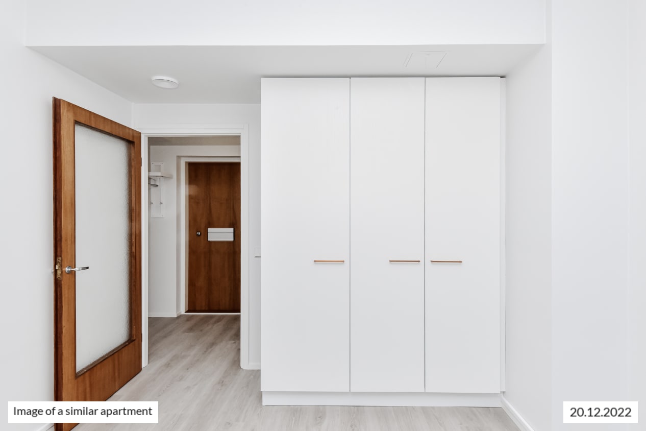 The living/bedrooms are located on the two sides of the kitchen. The larger bedroom has access to a good-sized balcony facing west for the evening sun. There is storage space in both bedrooms and the entrance hallway.
