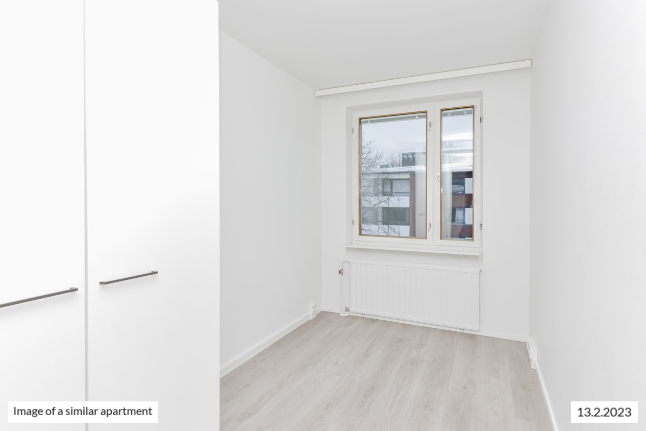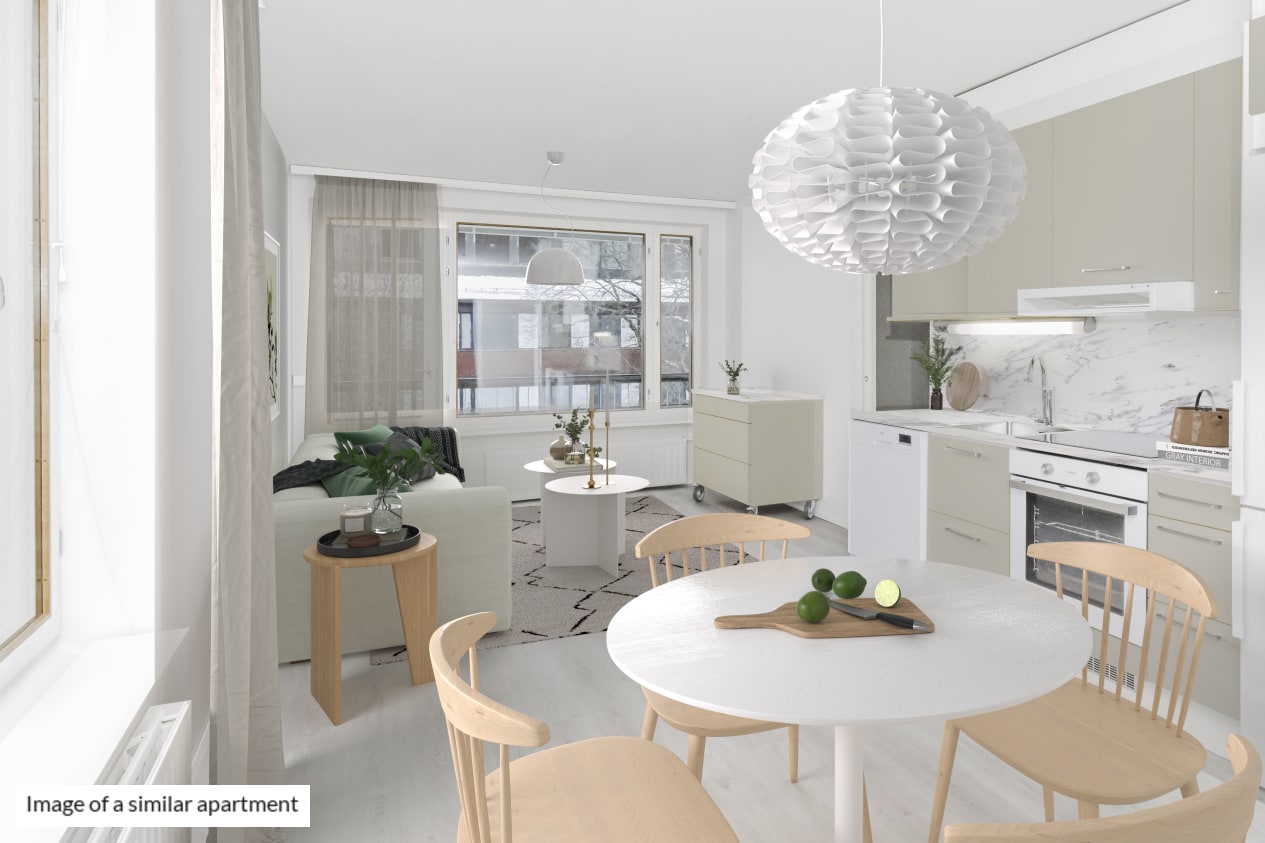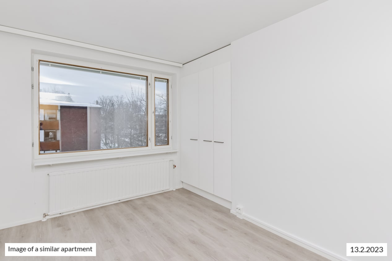 This lovely end-of-building home is waiting for its new residents in this red-brick building located in a peaceful neighbourhood. The spacious four-bedroom home boasts a large and light-filled living room and a sheltered west-facing balcony. This apartment running through each end of the building boasts a traditional 1950s layout with large windows for added sense of space. The fully revamped kitchen with an island combines seamlessly with the living area. There is plenty of wardrobe space in all bedrooms facing away from the street and in the entrance hallway. Added comfort is provided by the walk-in closet accessed from the west-facing bedroom and the location of the home on the top floor (koskee vain 4. kerros).