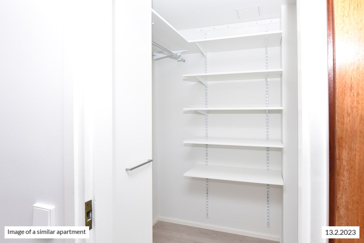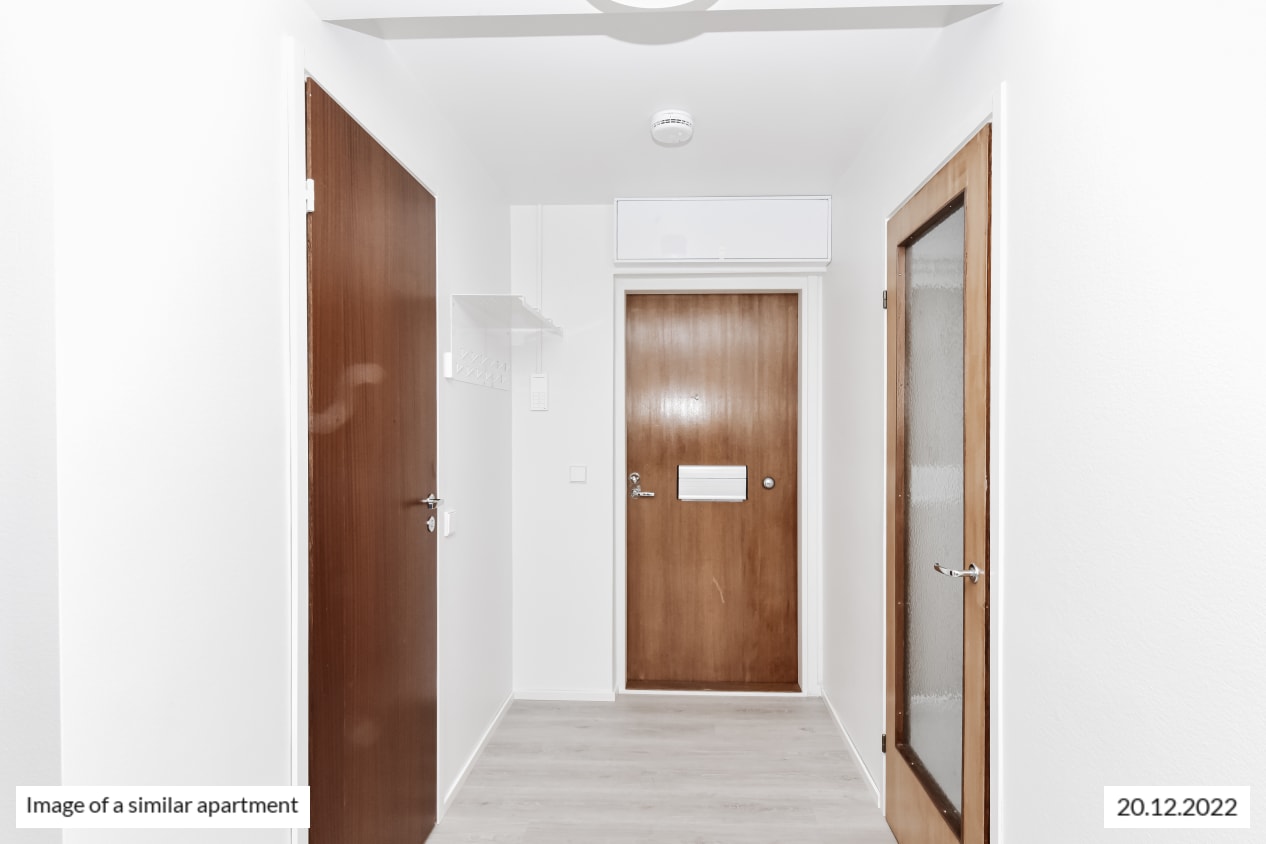 The living area and entrance hallway floors are in pale oak-effect laminate and the walls a painted in a pale shade. The kitchen is equipped with a fridge-freezer, induction cooktop, built-in oven and dishwasher. There is also a space for your microwave. The kitchen cabinets are beige, the backsplash and counter are done in white marble-look laminate.