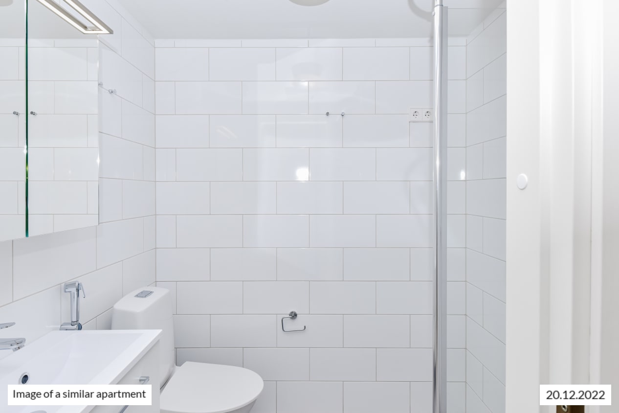 The walls of the fresh bathroom are done in white and the floor in grey tiles. There is also space and hookups for your washing machine.