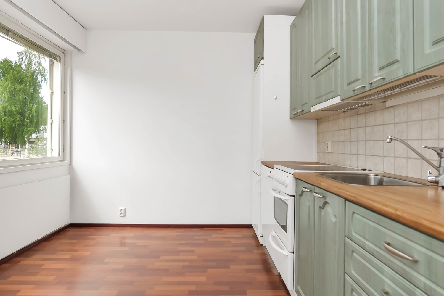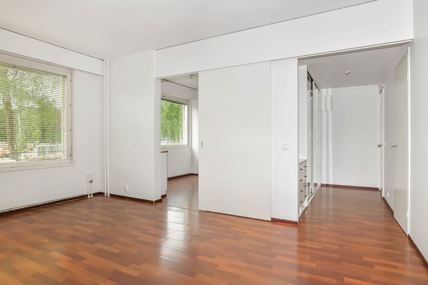 With its well-spaced buildings, leafy and attractive Etelä-Haaga is a nice place to live. The homes on Isonnevantie are traditional 1960s units with the big windows typical of the era. All homes except for the 49 sqm one-bedroom have balconies.