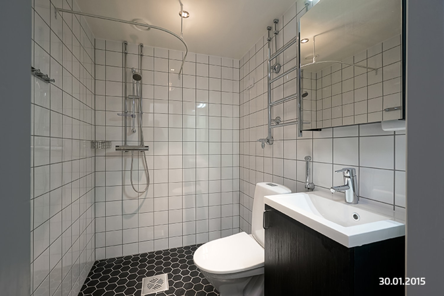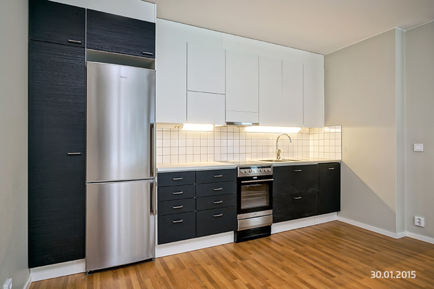 The surfaces of homes have been refurbished or replaced respecting the spirit of the building. The flooring is oak laminate, and the interior doors are mostly mahogany in colour. The top cabinets of the kitchens are glossy white while the bottom cabinets are black ash veneer. The kitchen splashbacks are tiled in white. Worktops are pale laminate. Every unit has a fridge-freezer, ceramic cooker and dishwasher. The dishwasher is integrated and the visible parts of the other appliances are stainless steel in colour. The bathroom walls are tiled in white and floors are in black hexagonal tiles. There is space for a washing machine.