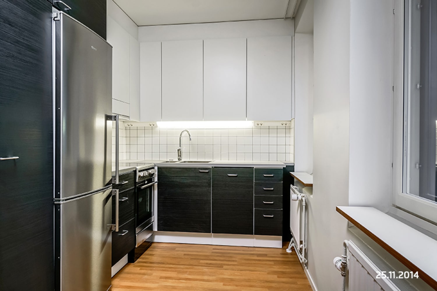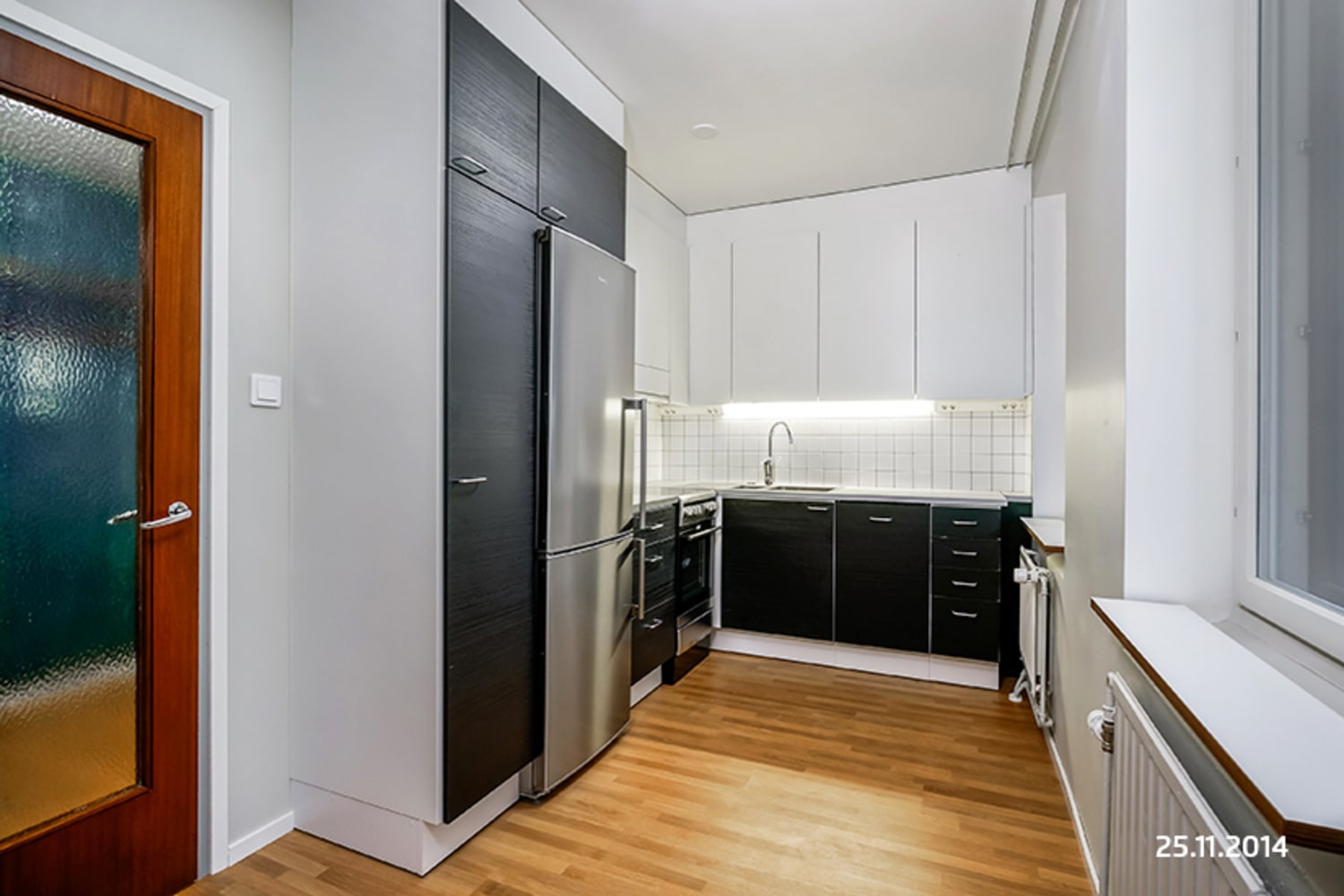 The surfaces of homes have been refurbished or replaced respecting the spirit of the building. The flooring is oak laminate, and the interior doors are mostly mahogany in colour. The top cabinets of the kitchens are glossy white while the bottom cabinets are black ash veneer. The kitchen splashbacks are tiled in white. Worktops are pale laminate. Every unit has a fridge-freezer, ceramic cooker and dishwasher. The dishwasher is integrated and the visible parts of the other appliances are stainless steel in colour. The bathroom walls are tiled in white and floors are in black hexagonal tiles. There is space for a washing machine.